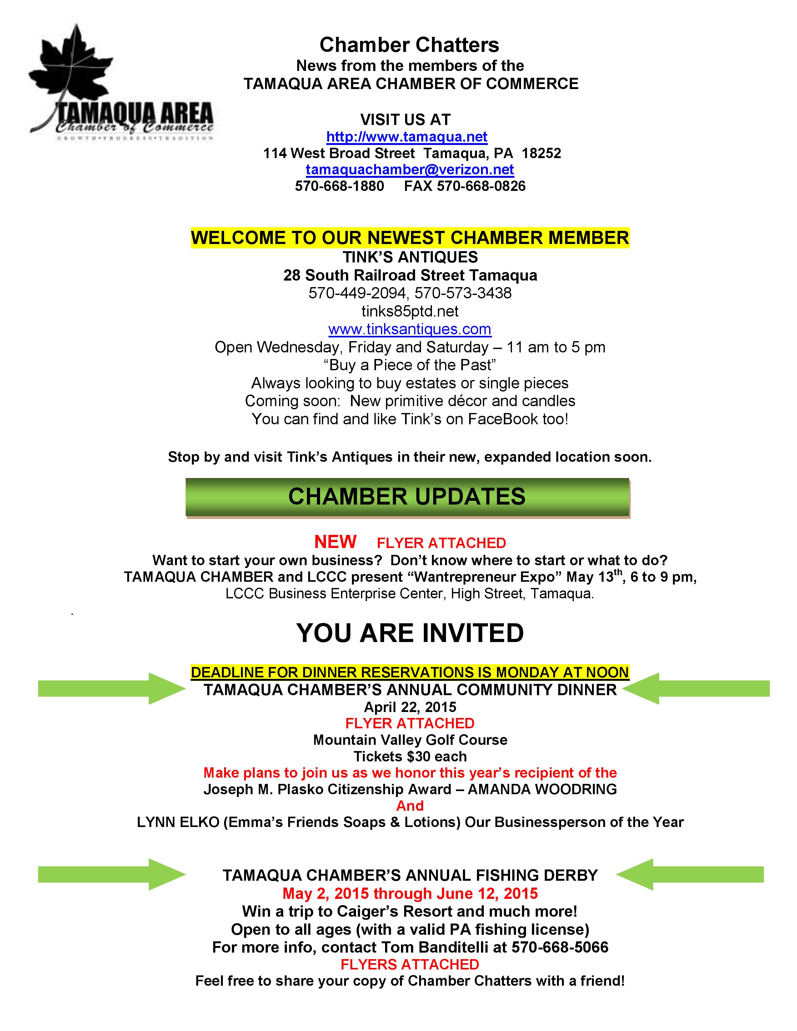 Here is the latest Tamaqua Area Chamber of Commerce’s Chamber Chatters newsletter dated Friday, April 17, 2015.