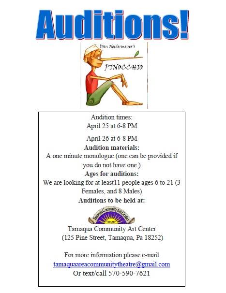 Auditions are being held for ‘Pinocchio” on Saturday, April 25 and Sunday, April 26, 2015 from 6 PM to 8 PM at the Tamaqua Community Arts Center.