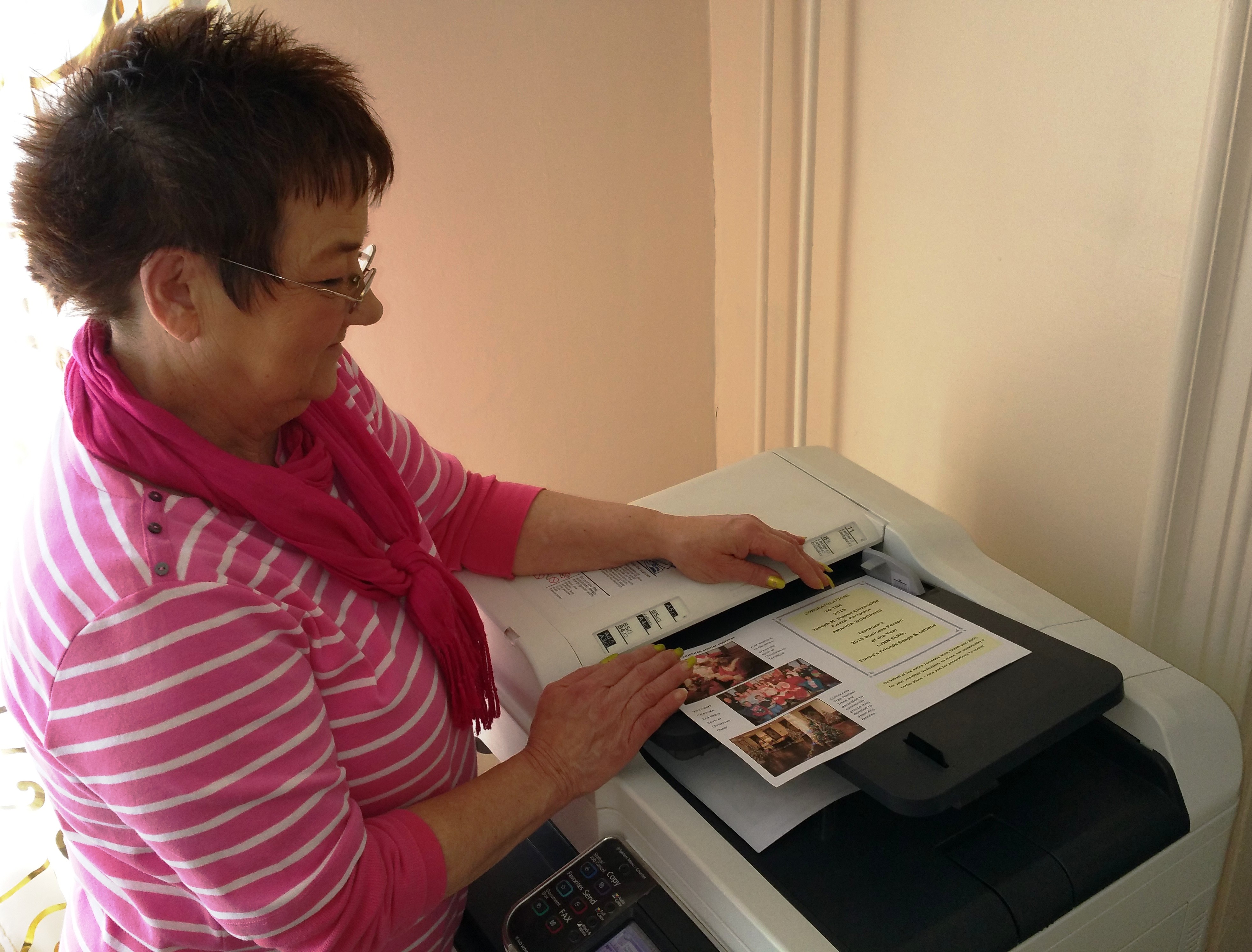 Linda Yulanavage, Executive Director, Tamaqua Area Chamber of Commerce, works over the weekend to make over 200 30-page, double-sided programs in preparation for Tamaqua’s Annual Community Dinner set for Wednesday April 22, 2015 at 5:30 PM at the Mountain Valley Golf Course in Barnesville.