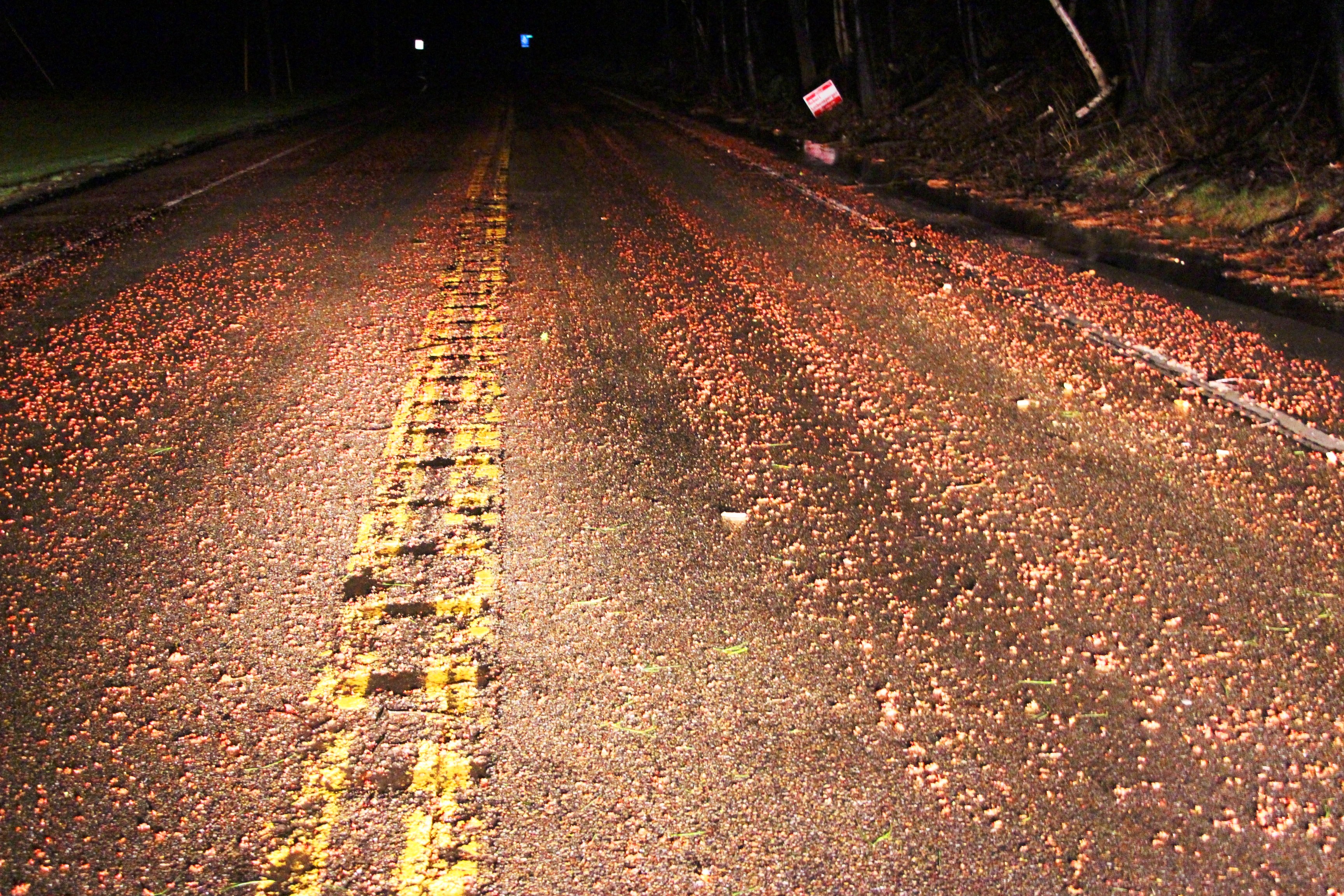 Large sections of Hauto Highway (SR54) in Rush Township were layered with tiny red maple tree flowers and seeds following last night’s (Monday, April 20, 2015) quick thunderstorm and high winds.
