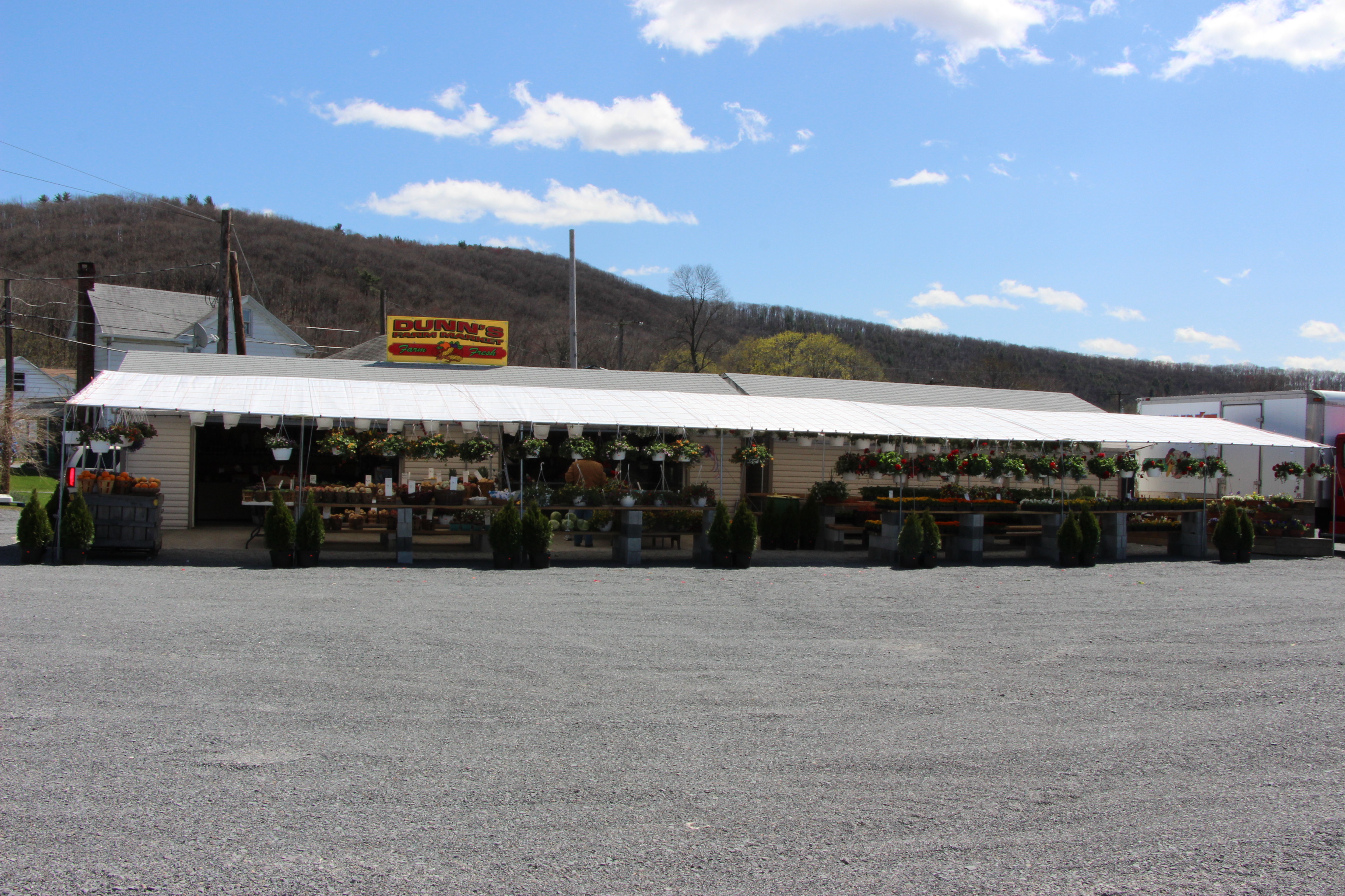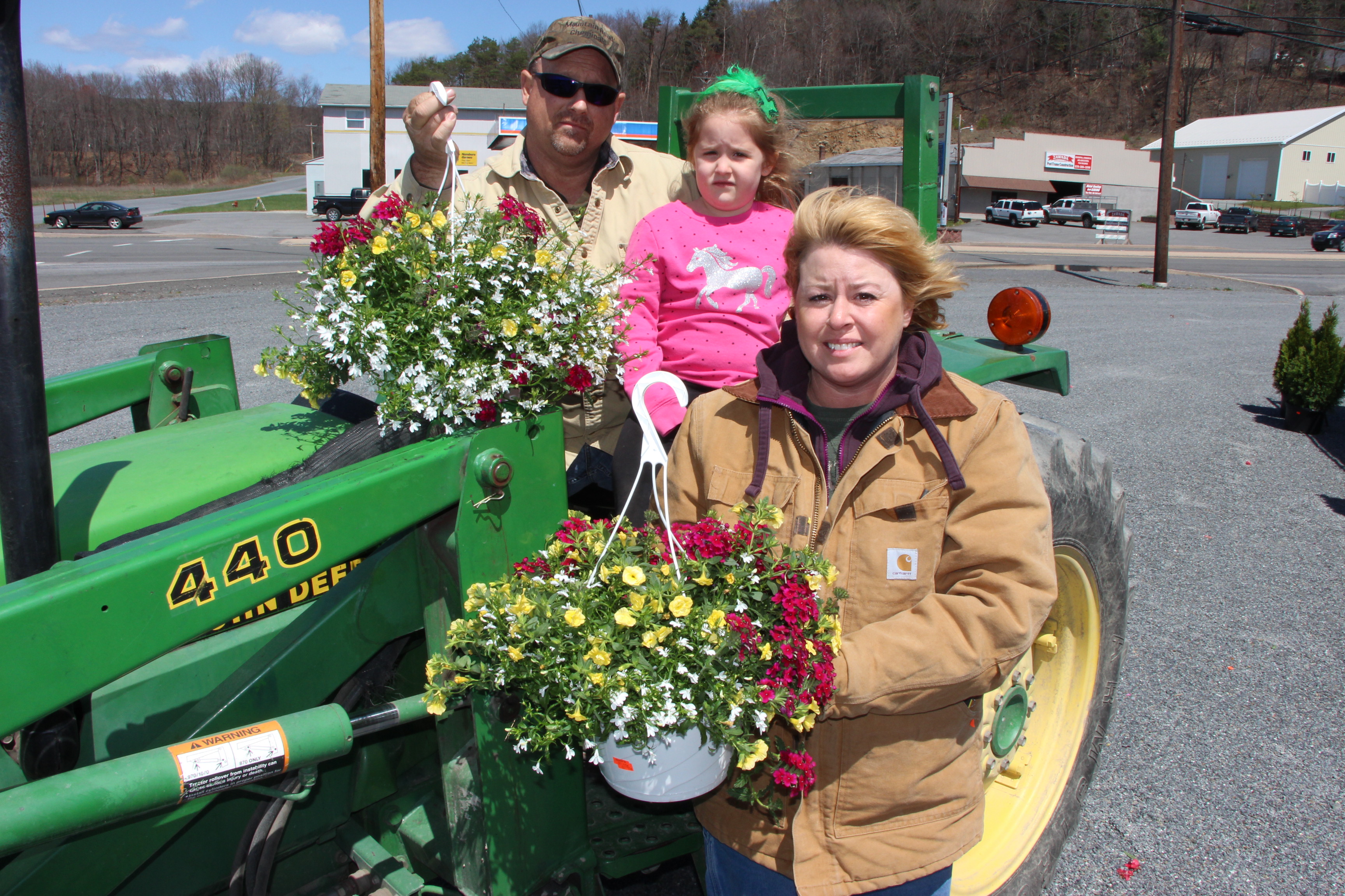Pictured displaying hanging flower baskets are Steve and Valarie Dunn, owners of Dunn’s Farm Market is West Penn, with daughter Madison, 5. Despite the unusual wind and cold, the Dunn’s said it hasn’t stopped people from buying their flowers. They added that once the wind and cold lessen in the next few days, they will be able to display a larger variety of flowers.