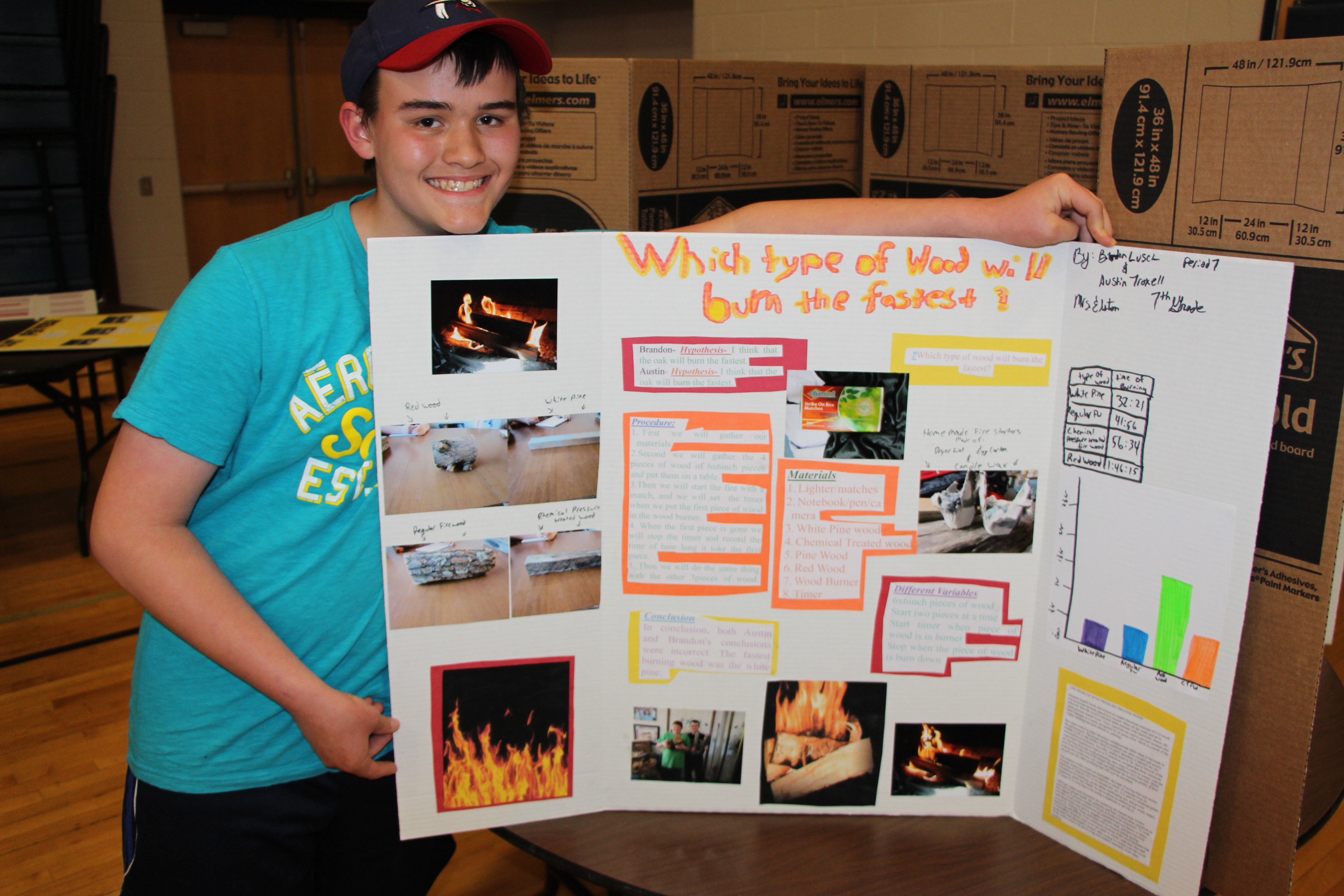 Pictured with his science project is Brandon Lusch of Mrs. Elston’s 7th grade class. His project was about which type of wood burns the fastest.