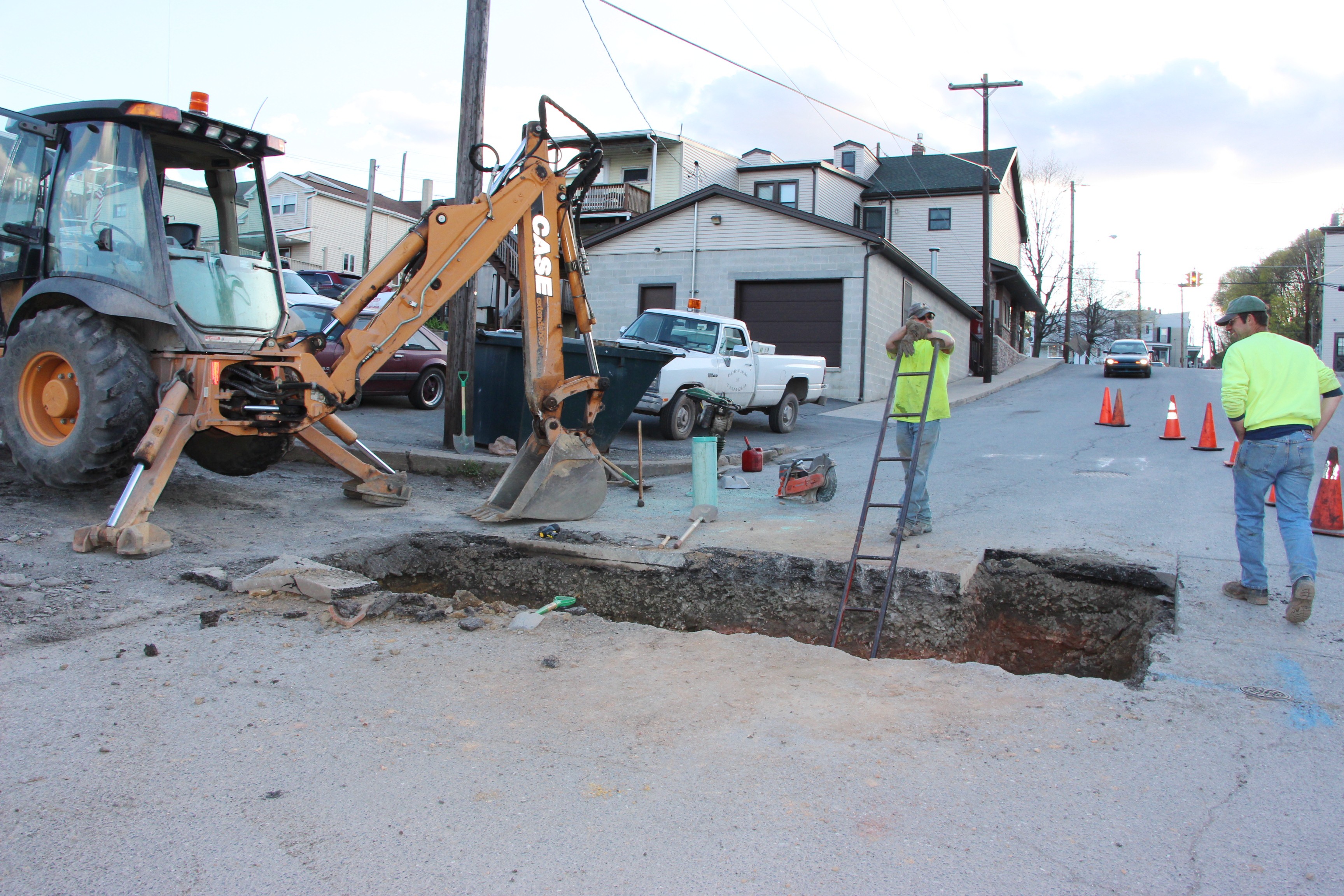 Pictured are Tamaqua Street Department and Water Department workers looking for a possible sewer line leak on Tuesday (April 28, 2015) under West Spruce Street, near Hunter Street. Luckily, no leak was found.