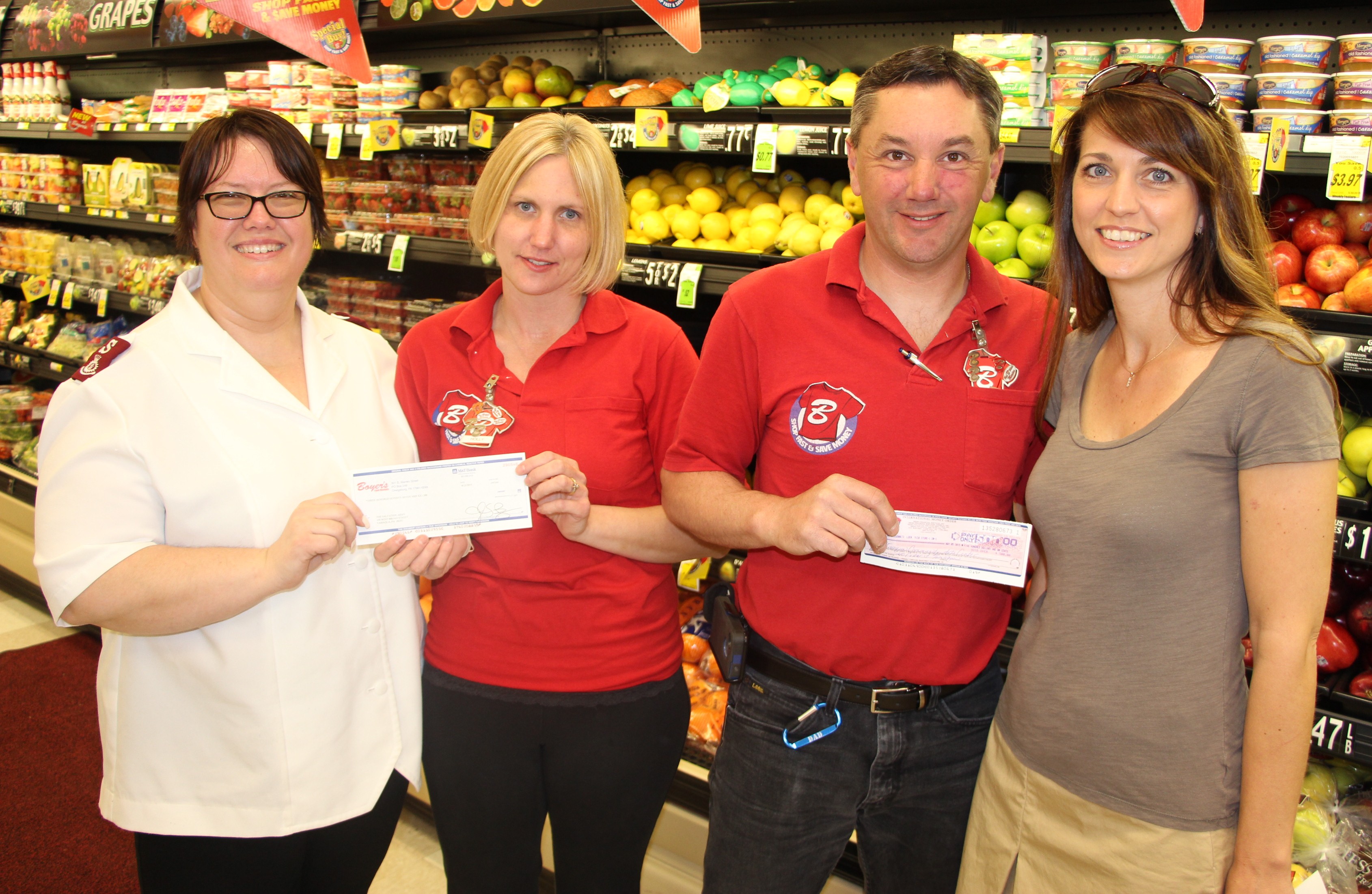 Boyer’s Food Market in Tamaqua made two generous donations yesterday (Wednesday, May 6, 2015) to two local non-profit organizations. Benefiting were Tamaqua Salvation Army and Tamaqua Community Arts Center. Boyer’s makes donations every year to various non-profits via their parking lot fund.