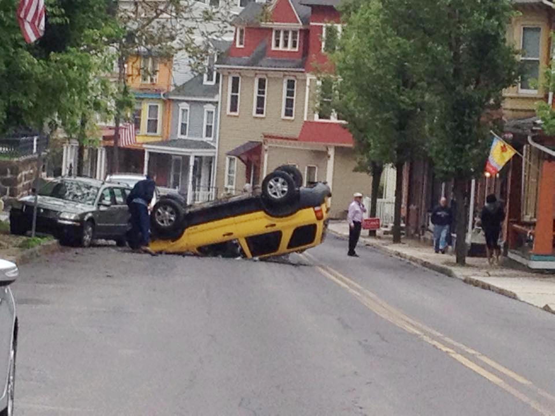 Pictured are submitted photos of an overturned sport utility vehicle this morning (Tuesday, May 19, 2015) along West Broadway (near the Old Jail Museum) in Jim Thorpe. The incident, which apparently involved a parked vehicle as well, occurred just before 10 AM in front of 145 West Broadway.