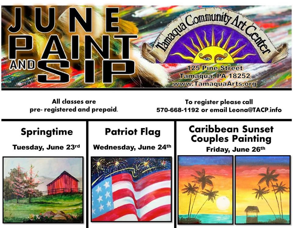 Below is a list of Paint and Sip sessions scheduled for June 2015 at the Tamaqua Community Arts Center. (link)