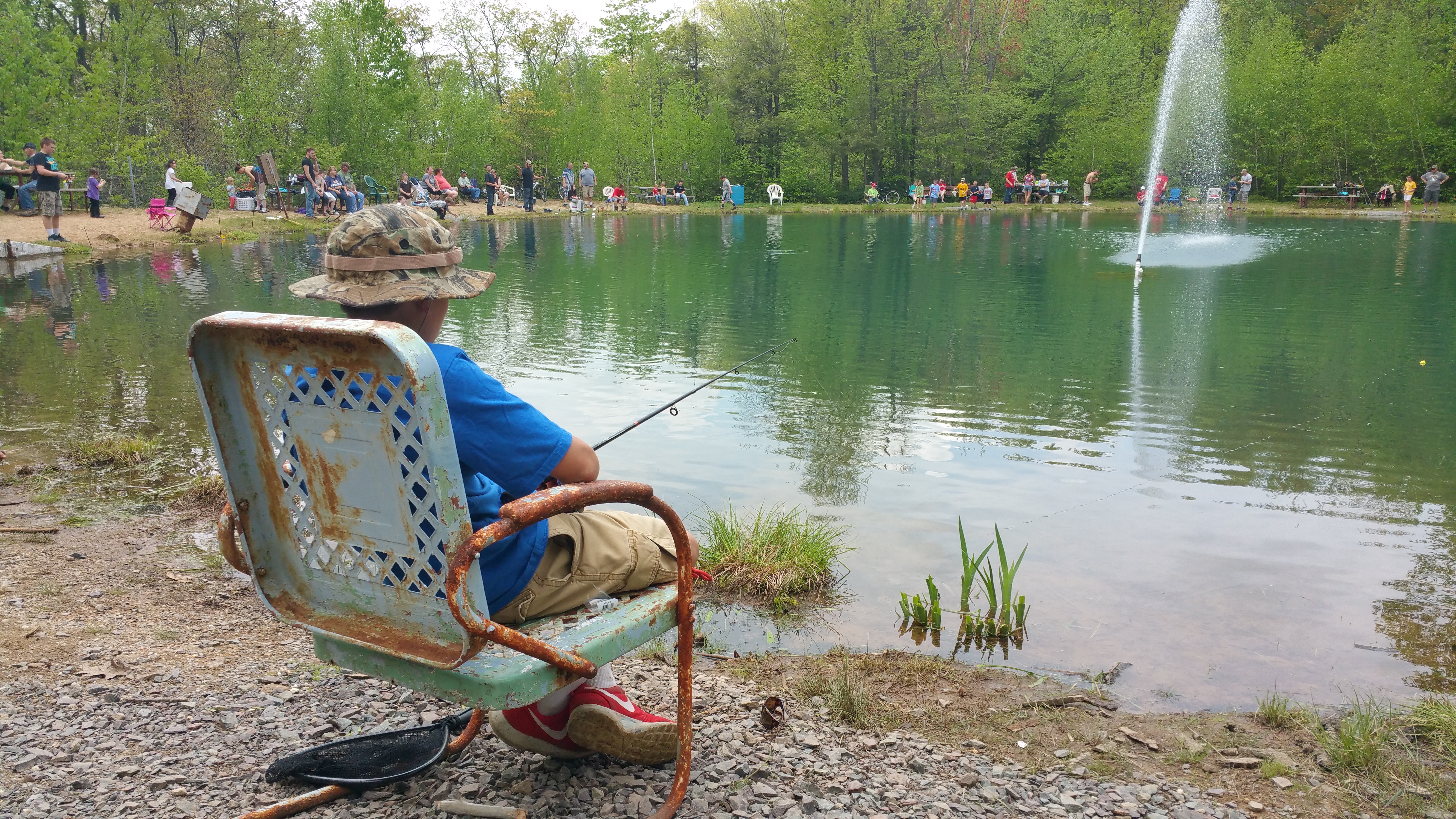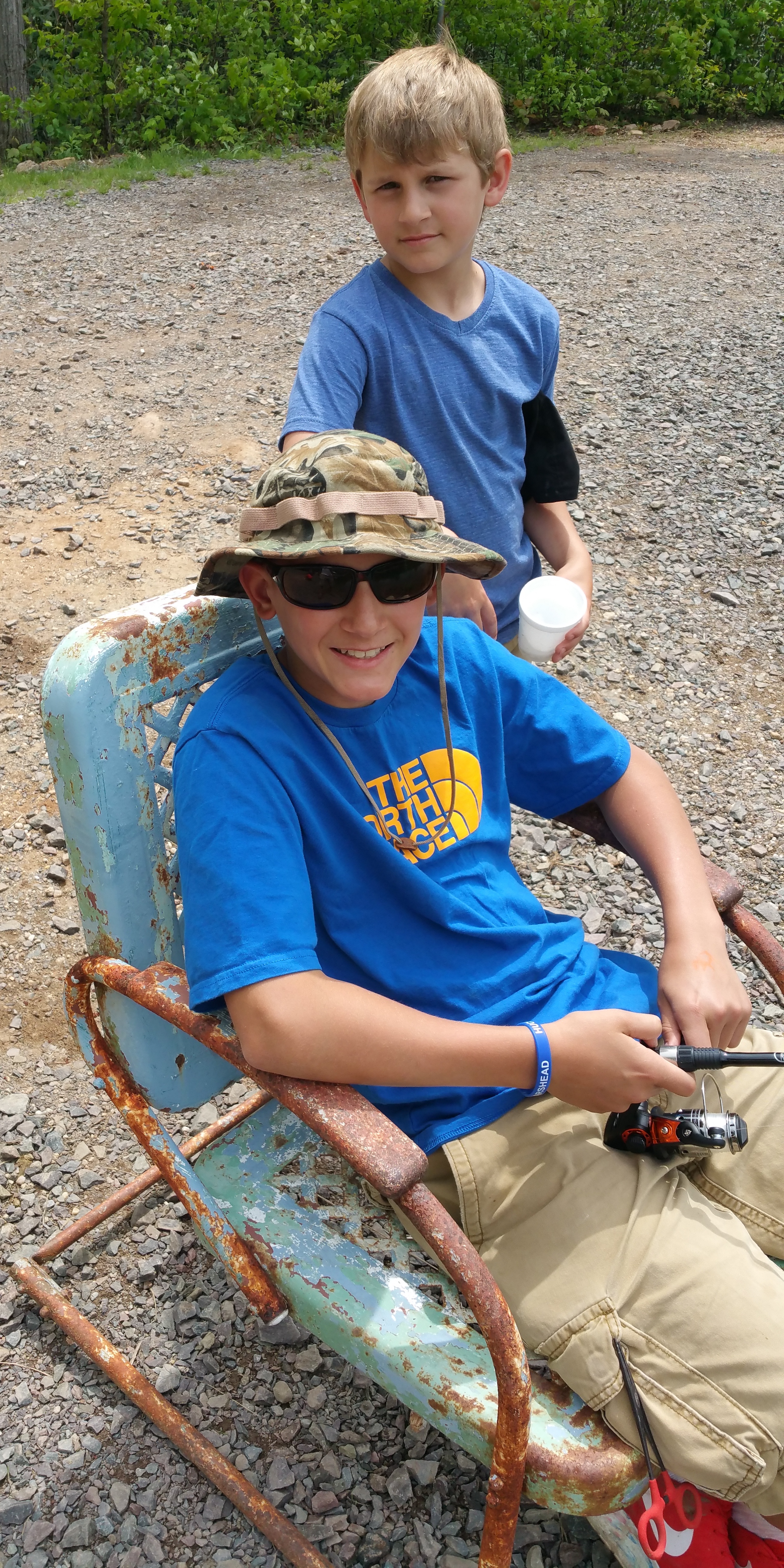 Max Kalb, 12, sitting, and his brother Garrett, 8, relax in an old metal chair as they fish during the Huck Finn Fishing Rodeo held recently in Delano. They are the sons of Brian and Ingrid Kalb of Shippensburg.