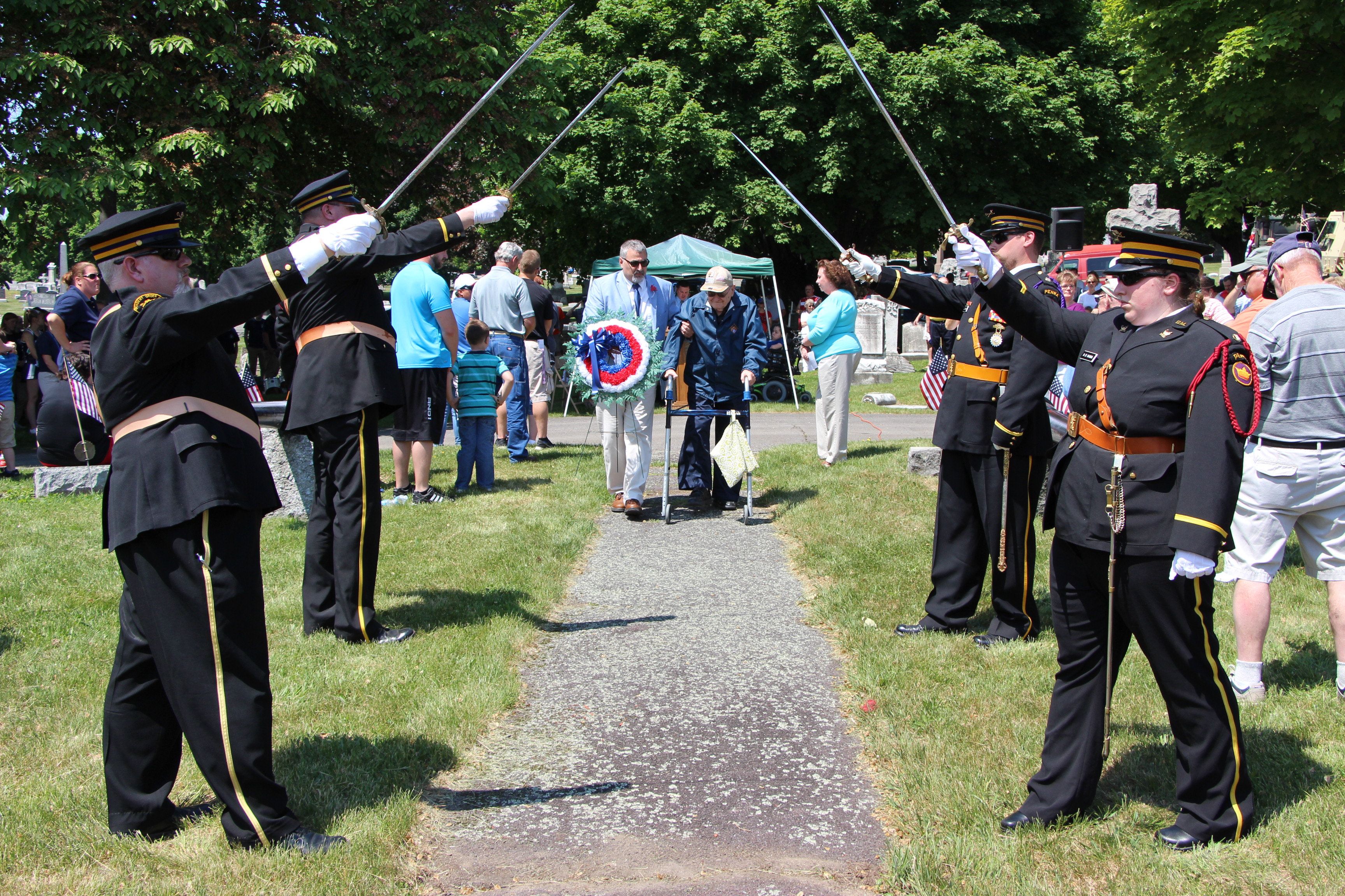 During the Roll Call of decease veterans, Tamaqua Mayor Chris Morrison escorted parade Grand Marshal Carl Hafer Sr. during the placement of the Memorial Wreath at Soldier’s Circle. Canton Allentown No. 39, Patriarchs Militant, Independent Order of Odd Fellows, also participated.