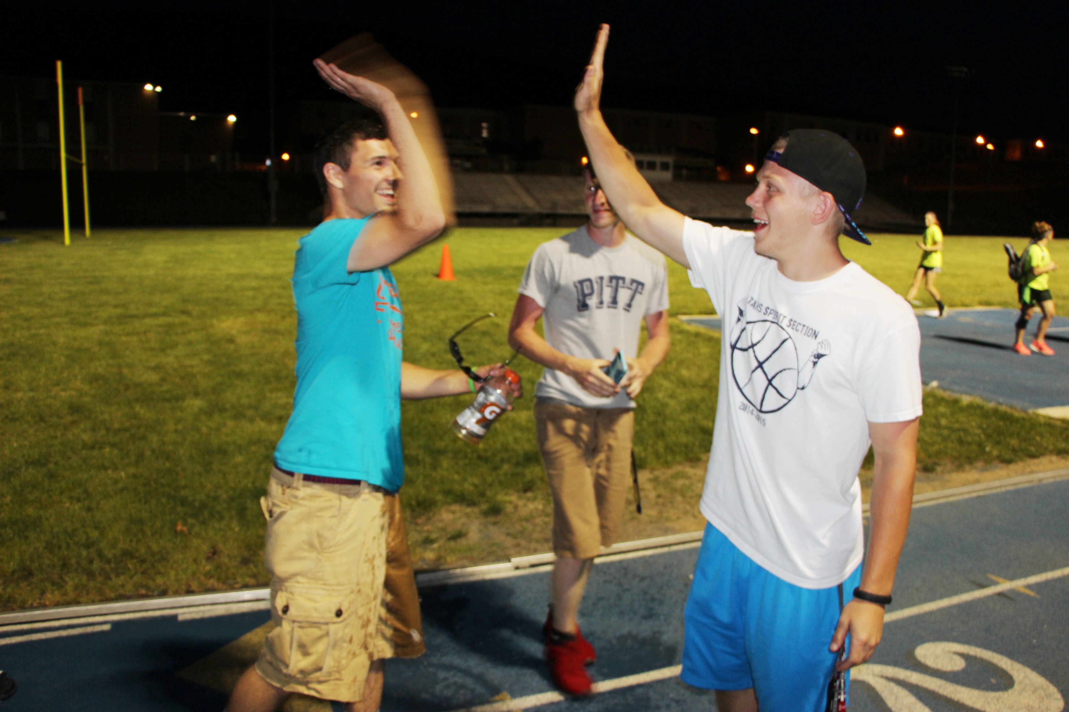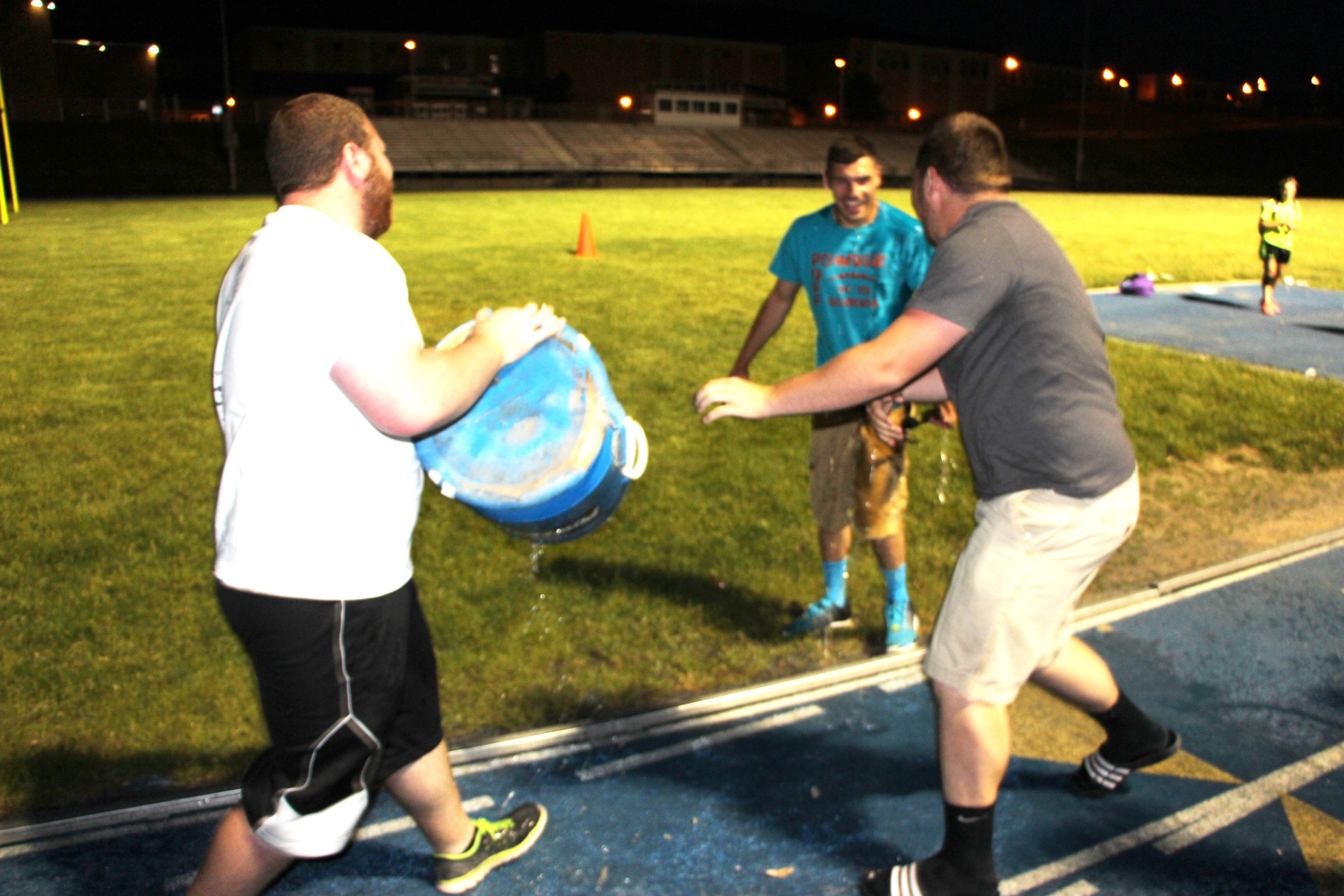Tamaqua High School senior Dylan Rynkiewicz receives a victory splash from Devin Murphy and Connor Hartung after leading his Tamaqua Powder Puff Girls football team to victory last night (Friday, May 29, 2015). Rynkiewicz, along with Trevor Skripko, served as coaches for the senior girls team.
