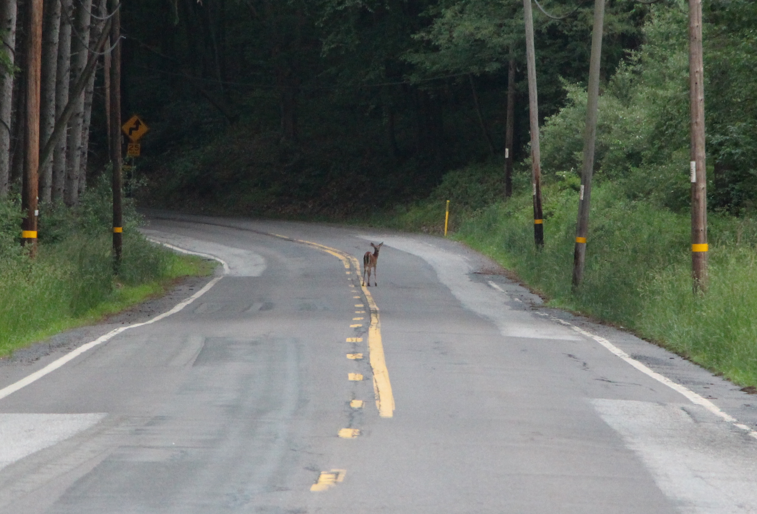 Pictured from a distance is a deer apparently “grazing” on Tuscarora Park Road in Rush Township. Two years ago, Pennsylvania was ranked second for your chance of impacting a deer, according to a State Farm report.
