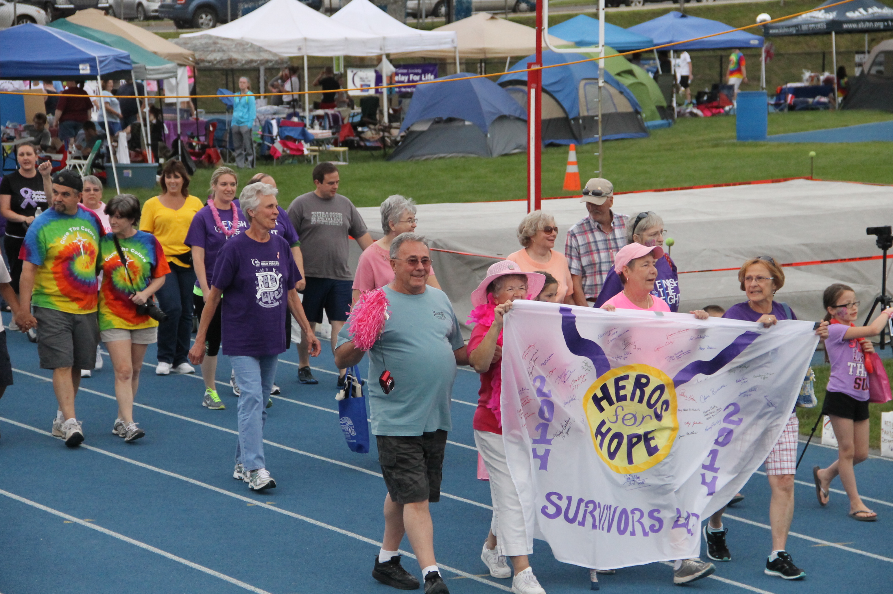During the Survivors Lap, upbeat music plays as all cancer survivors at the event take the first lap around the track cheered on by the other participants who line the track, celebrating their victory over cancer.
