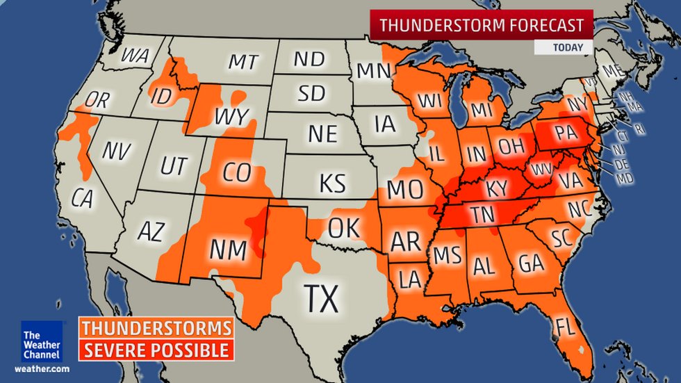 The cold front responsible for the severe weather will push east bringing the risk of strong to severe thunderstorms from southeastern Missouri through Kentucky, Tennessee, southern Ohio, West Virginia, Maryland, Virginia, Pennsylvania, New Jersey and southern New York.