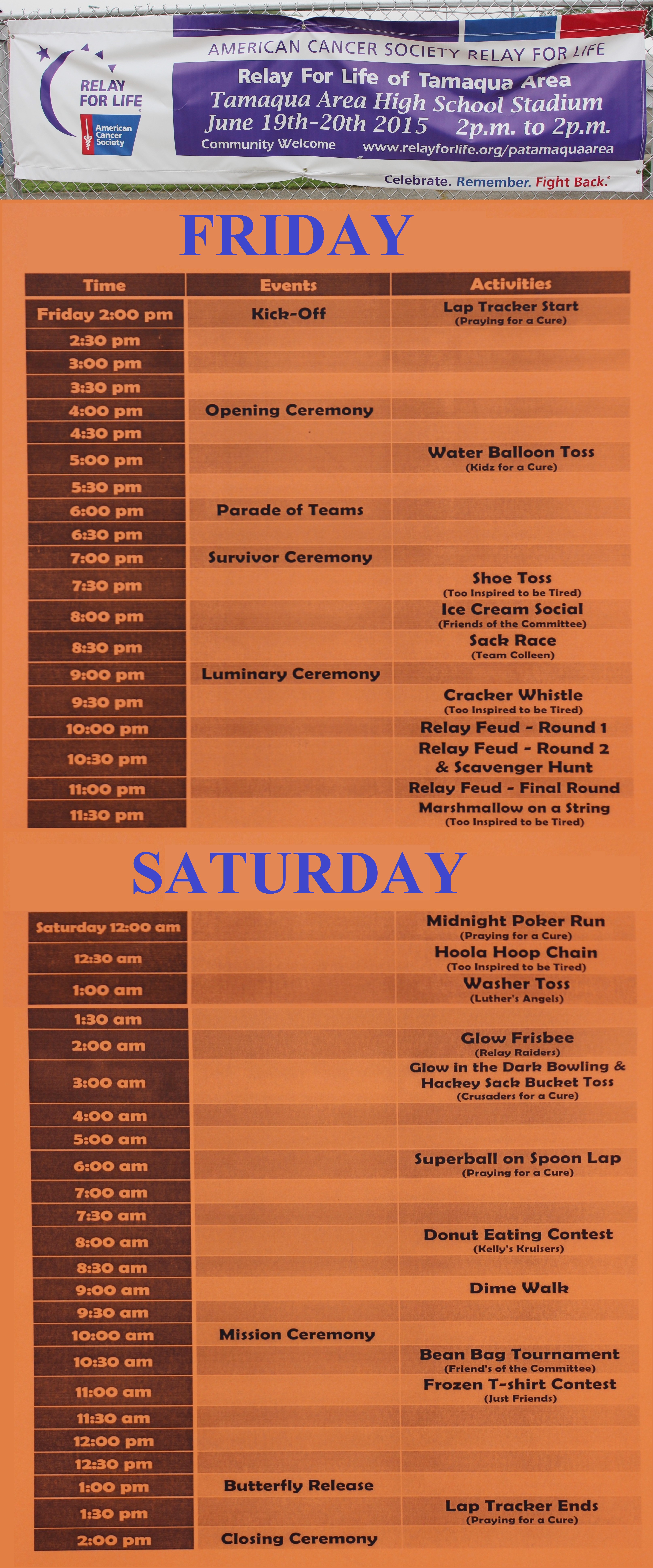 Walkers, volunteers, cancer survivors and visitors are encouraged to stop by anytime during the event.Click HERE to view the schedule of events for the 24-hour event.