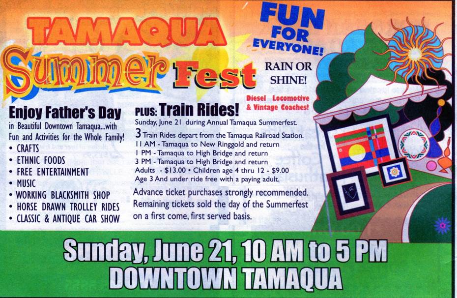 The festival, sponsored by the Tamaqua Historical Society, includes train rides from the station, classic and antique car show, large street fair, crafts, ethnic foods, a variety of music, historical tours, working blacksmith shop, horse drawn trolley rides, exhibits and free entertainment.