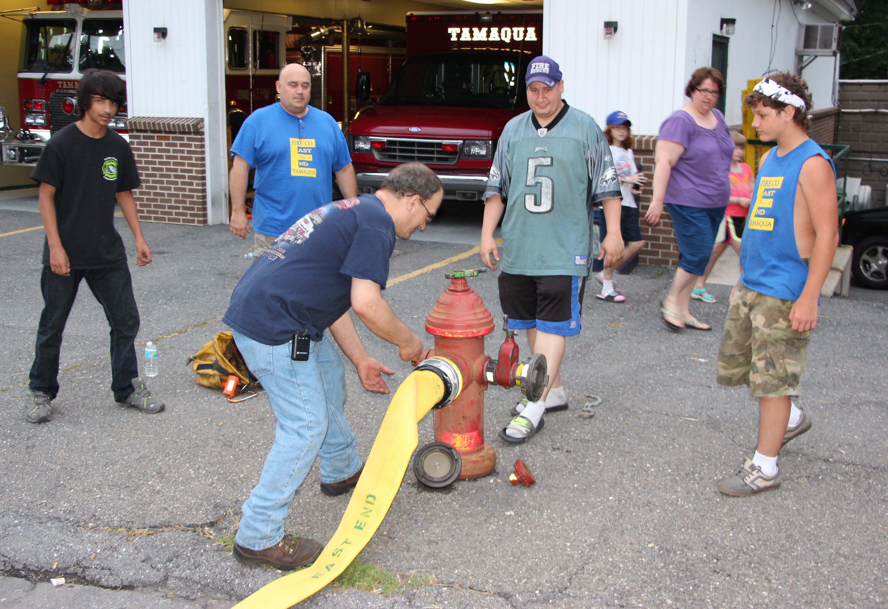 East End Fire Chief Michael Angelo spent time training firefighters and junior firefighters regarding hydrant operations. Also pictured is firefighters Nathan Bowman, Troy Hottenstein, and junior firefighters Ryan Smith and Brandon Hottenstein.