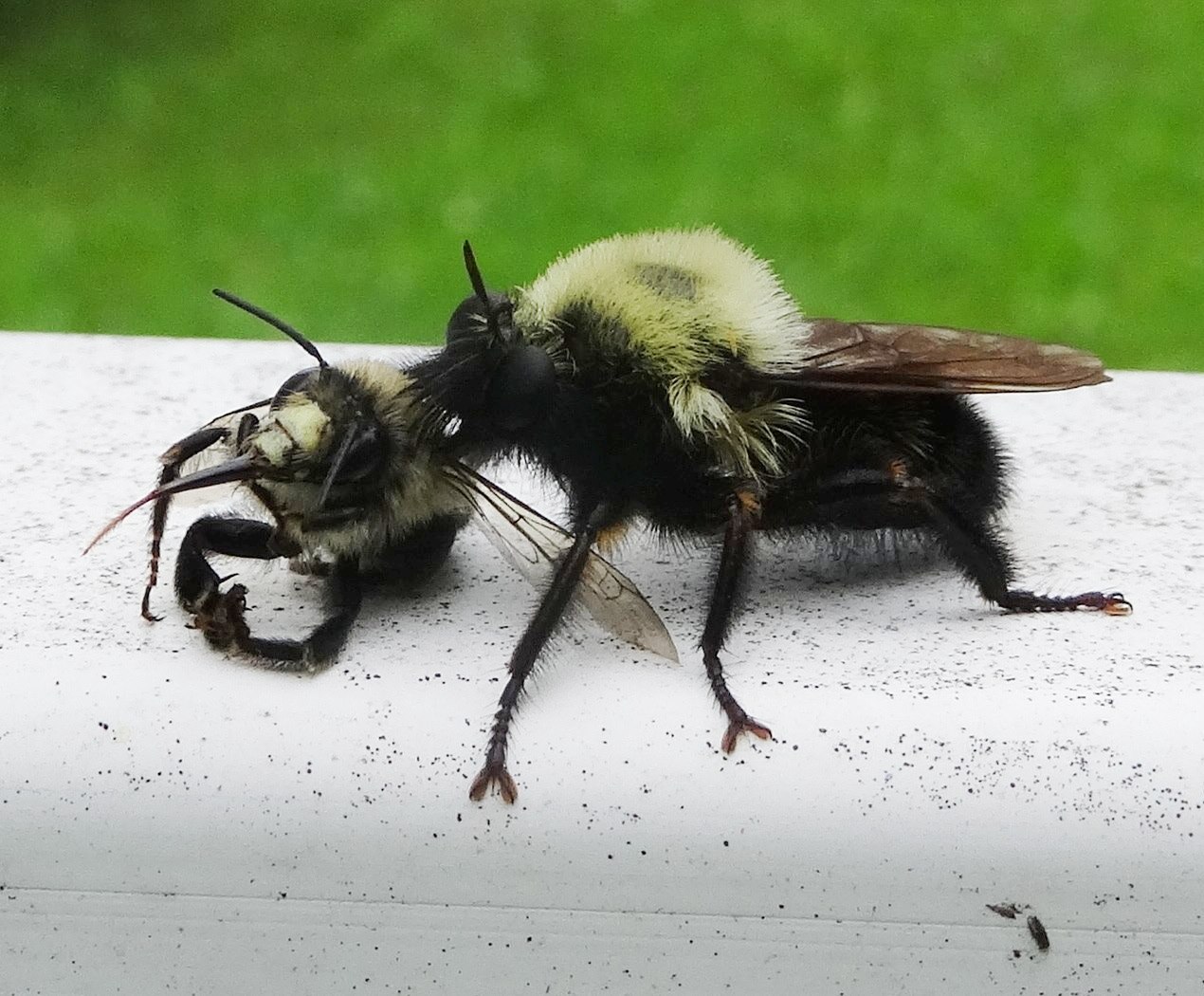 Pictured are a few photos taken recently of a Laphria fly, a bee-like robber fly, preying on a bumblebee. Photos are from Mark Schreader of Palo Alto (Schuylkill County, PA).