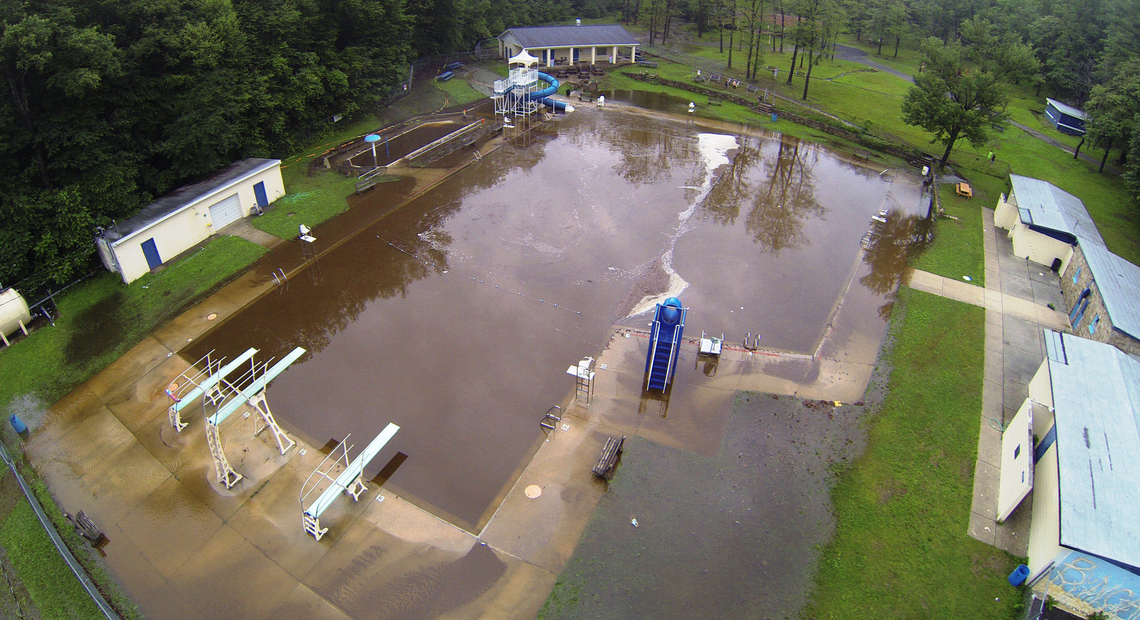 In addition to road damage and structural flooding, today’s (Tuesday, June 30, 2015) flash flooding spilled dirt, soil and thousands of gallons of rain runoff into the H.D. Buehler Memorial Bungalow Pool in Tamaqua.