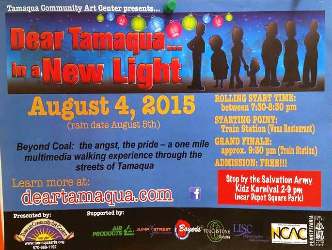 Dear Tamaqua debuts August 4th at 7:30pm during National Night Out. The rain date for the event is August 5th. Also happening on August 4th is the Tamaqua Salvation Army’s Kidz Karnival, rain or shine, which kicks off Tamaqua’s National Night Out with family fun for children ages 3-12. Karnival goers will enjoy food, games, prizes, rides, and activities from 2 p.m. until 9 p.m. at the North Railroad Street parking lot (across the tracks from the Tamaqua Train Station). Tickets are available for purchase at The Tamaqua Salvation Army, Tamaqua Chamber of Commerce and Hiles Brothers in Summit Hill; they will also be available at the Kidz Karnival. Further information on Kidz Karnival is available through Major Sharon Whispell at 508-574-9950 or Dina Depos at 570-668-0410. Further information on Dear Tamaqua…In a New Light (parking, mobility access, etc.) is available at www.deartamaqua.com. To get involved in the project, or to make a monetary or in-kind donation, please contact Leona Rega, Tamaqua Community Arts Center Director, at 570-668-1192 or Leona@tacp.info.