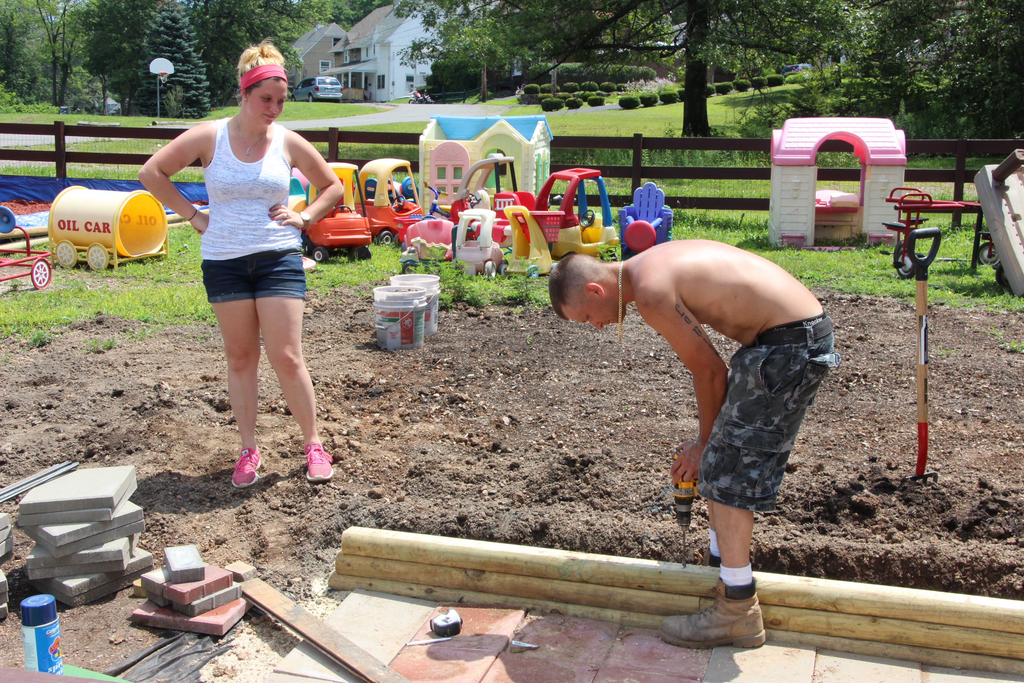 Yesterday’s (Sunday, July 19, 2015) heat advisory didn’t stop Jordan Bachert or MC Petritsch from getting work done at Little Bear Cub Care on East Miners Street in Seek (Coaldale). Both spent their day off performing upgrades to the center’s playground.