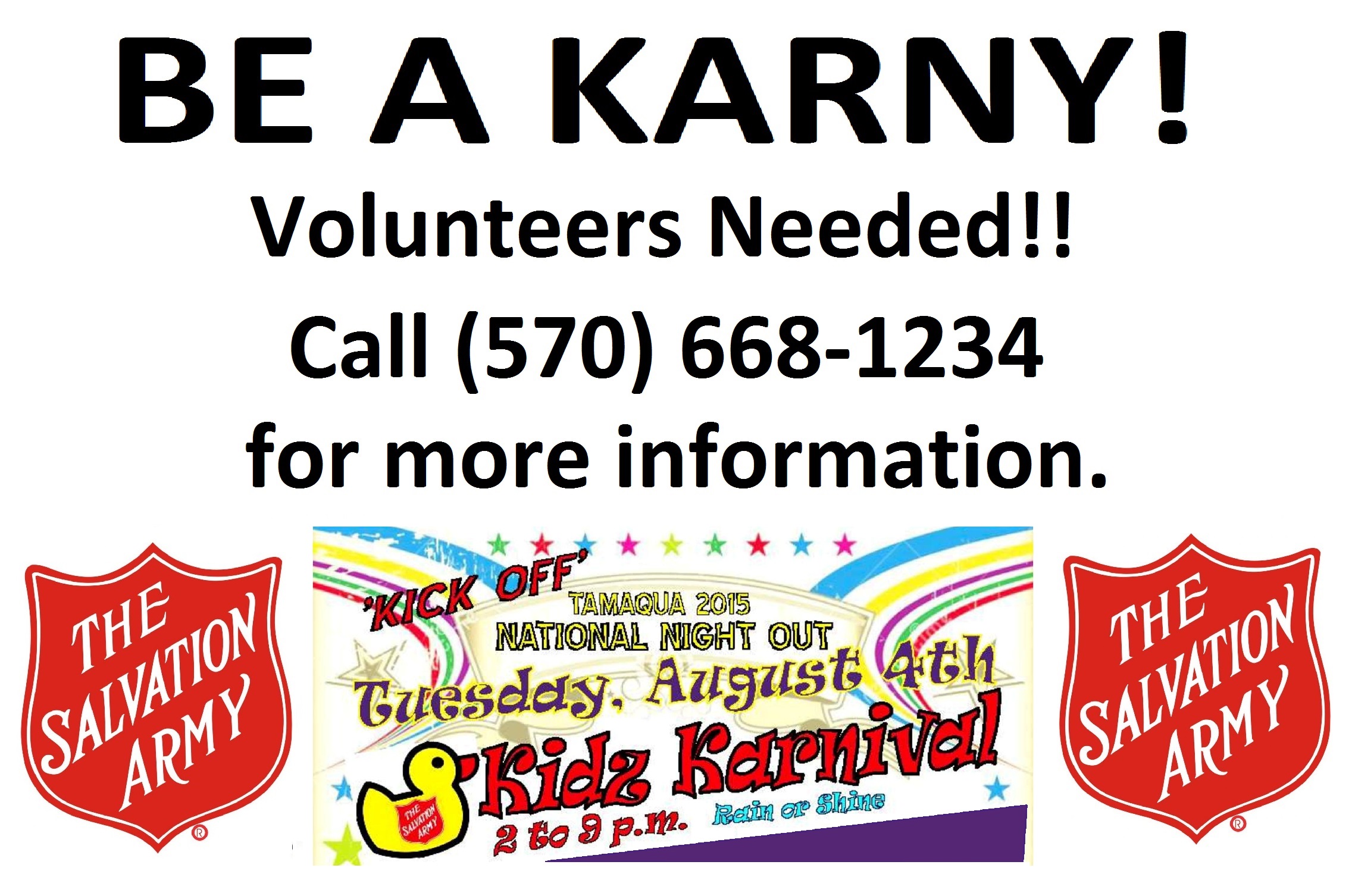 Salvation Army carnival volunteers, aka ,”karnies”, are needed to help during their second annual ‘Kidz Karnival’ set for Tuesday, August 4, 2015 at the North Railroad Street parking lot (in front of the Tamaqua Train Station). Volunteers will be needed to man games, as well as help setup and cleanup.