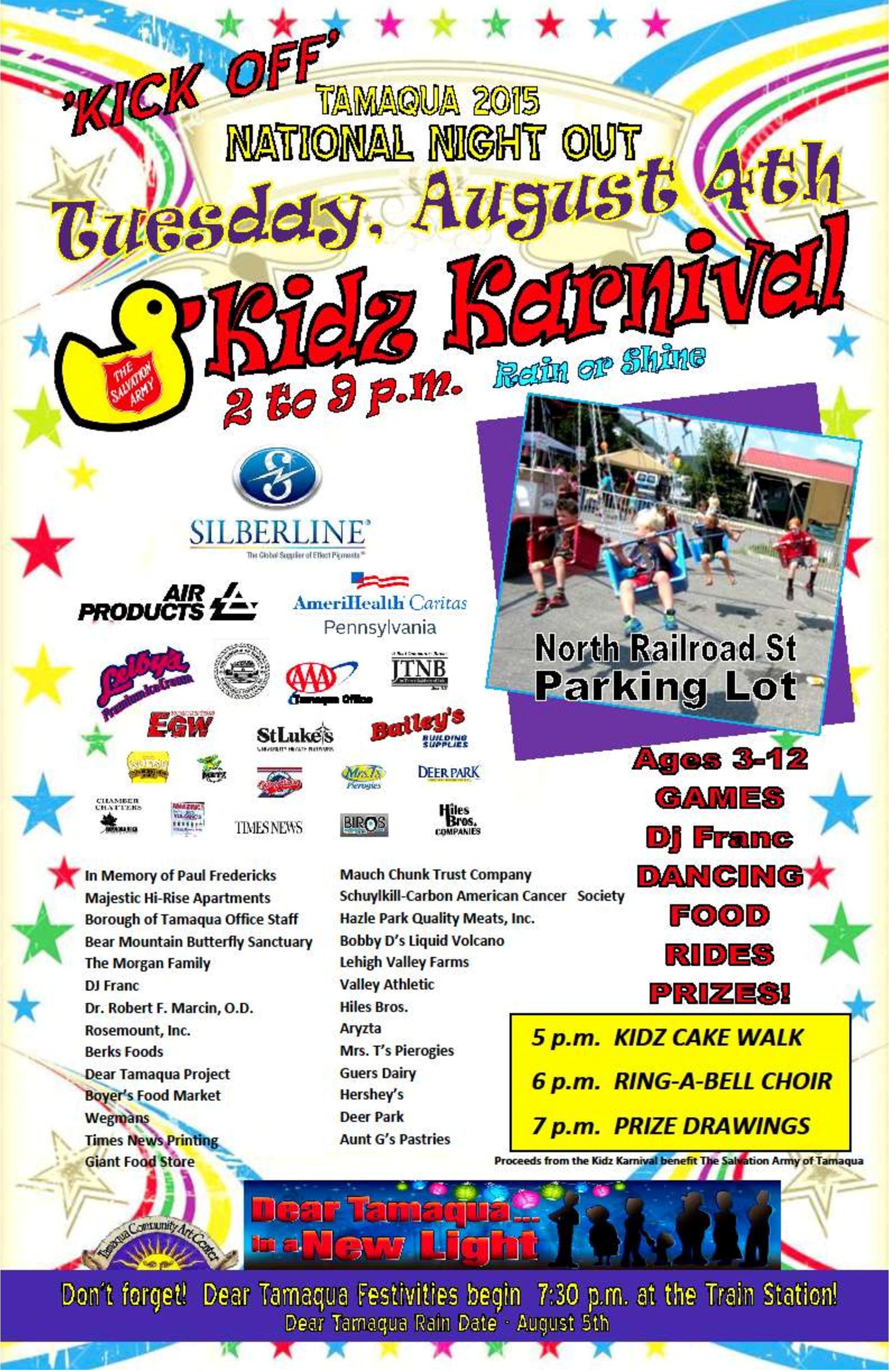Members and volunteers with the Tamaqua Salvation Army are holding their Second Annual ‘Kidz Karnival’ event today, Tuesday, August 4, 2015 from 2 PM to 9 PM at the North Railroad Street parking lot (in front of the train station) in Tamaqua.