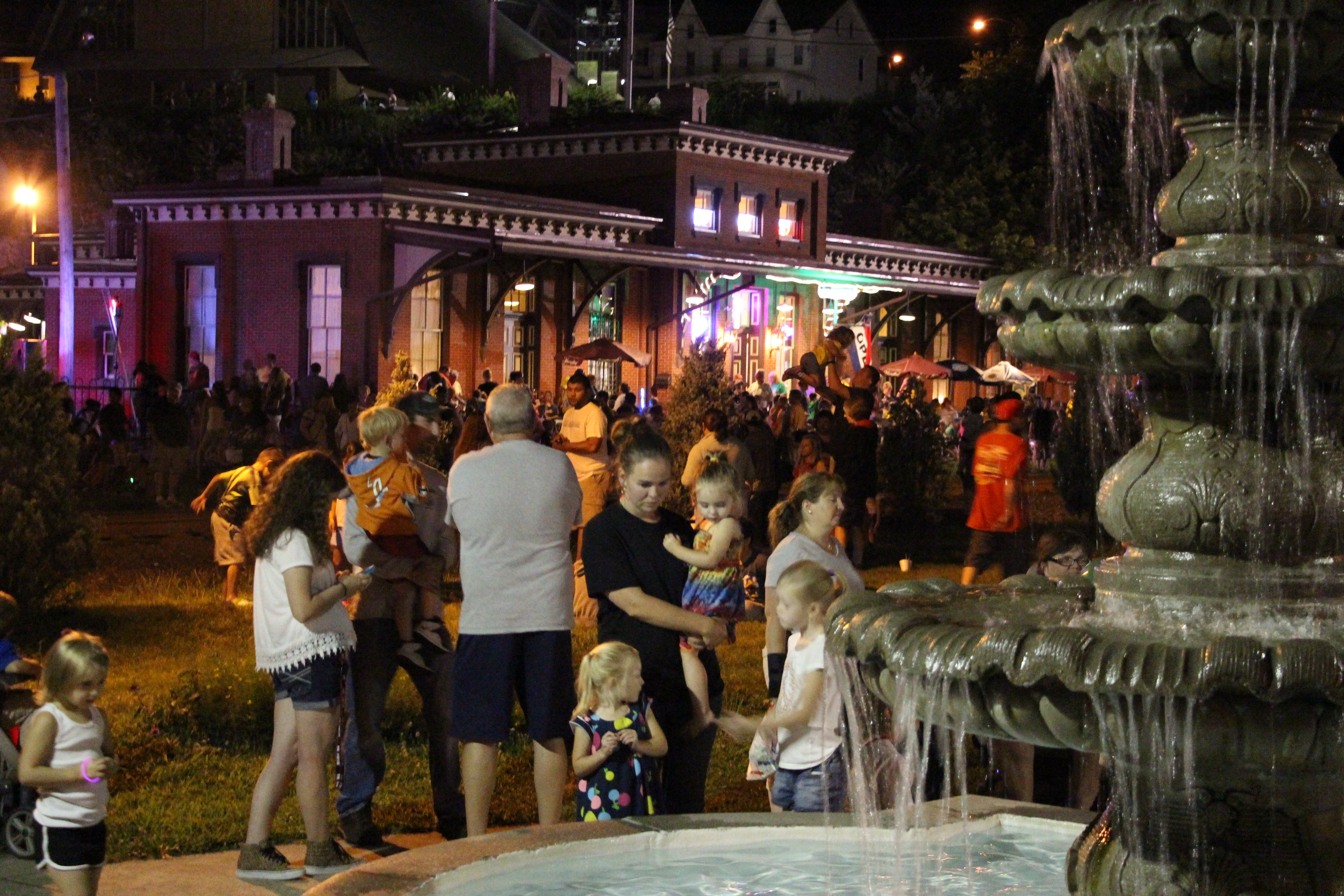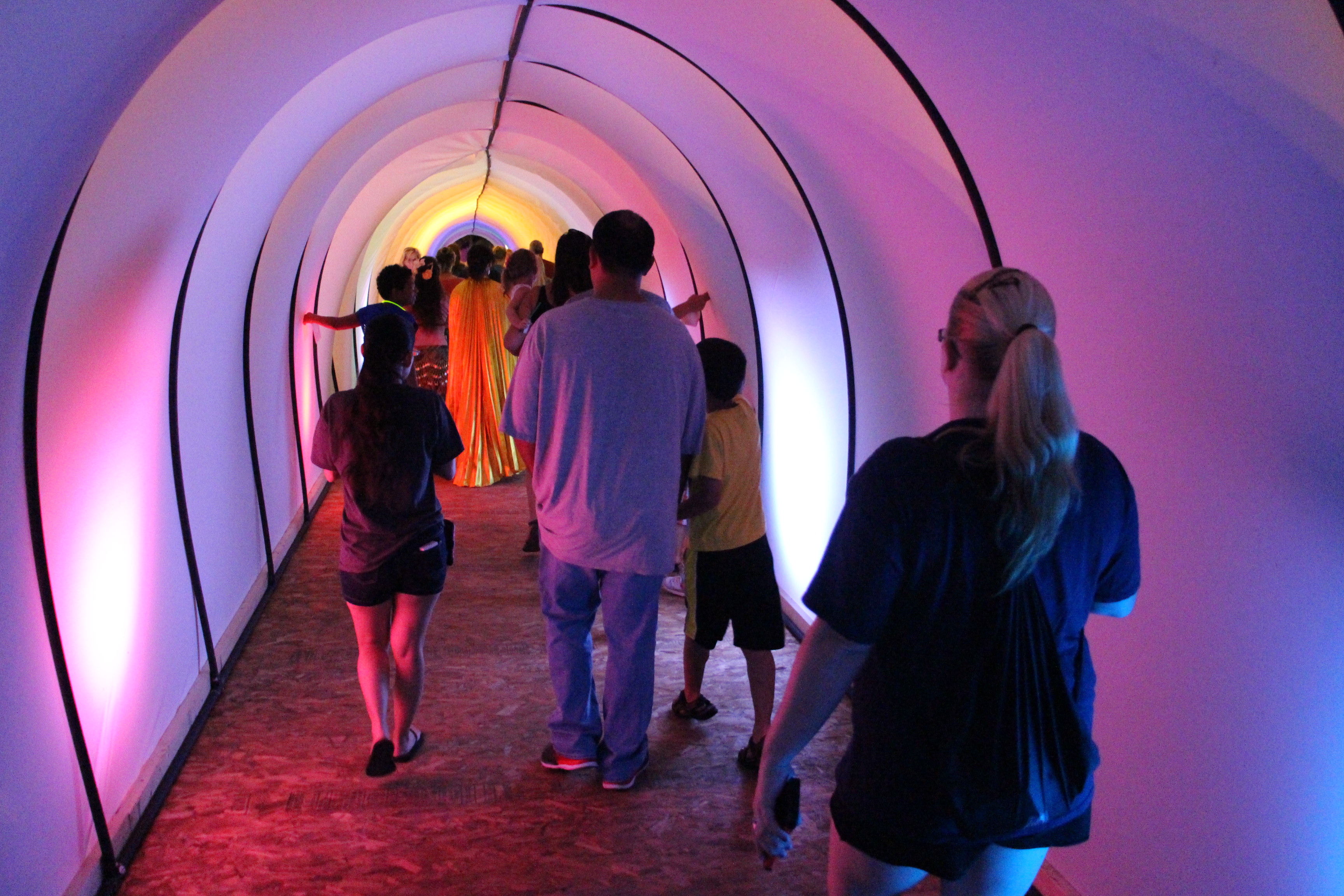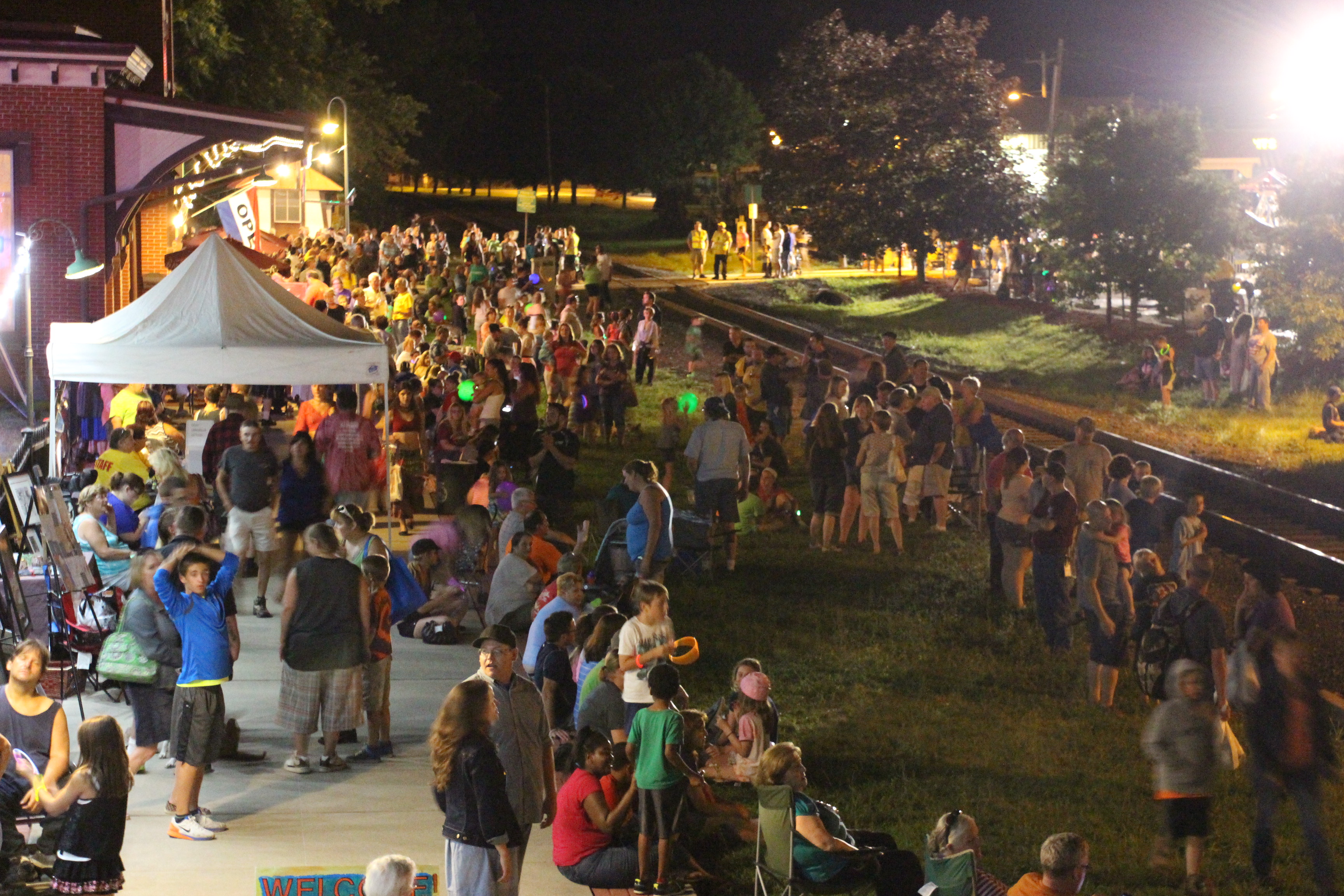 Continuing the walk, visitors were treated to another mini community block party, consisting of food, music, activities, educational booths and other items related to the National Night Out. From there, visitors traveled along Swatara Street onto Hegarty Avenue where another jumbo screen showed them videos and photos from the past. Hegarty Avenue also included various artworks drawn onto large boards. These images were from the 600 submitted ‘Dear Tamaqua’ letters. As they continued east on Hegarty Avenue, numerous actors and actresses (on on their own mini-stage) read aloud some of those letters. At the intersection of Berwick Street, visitors were, yet again, treated to another jumbo screen showing more photos and videos from Tamaqua’s past. From there, visitor continued east on Berwick Street, passing musicians and laser lights. The tour ended with a walk through a 400-foot long cloth tunnel, called the “Reflection Tunnel”. While in the tunnel, visitors could hear music while reading motivational statements or words that appeared on the walls. The event ended with a dual fireworks show over the Dutch Hill and East End mountains.