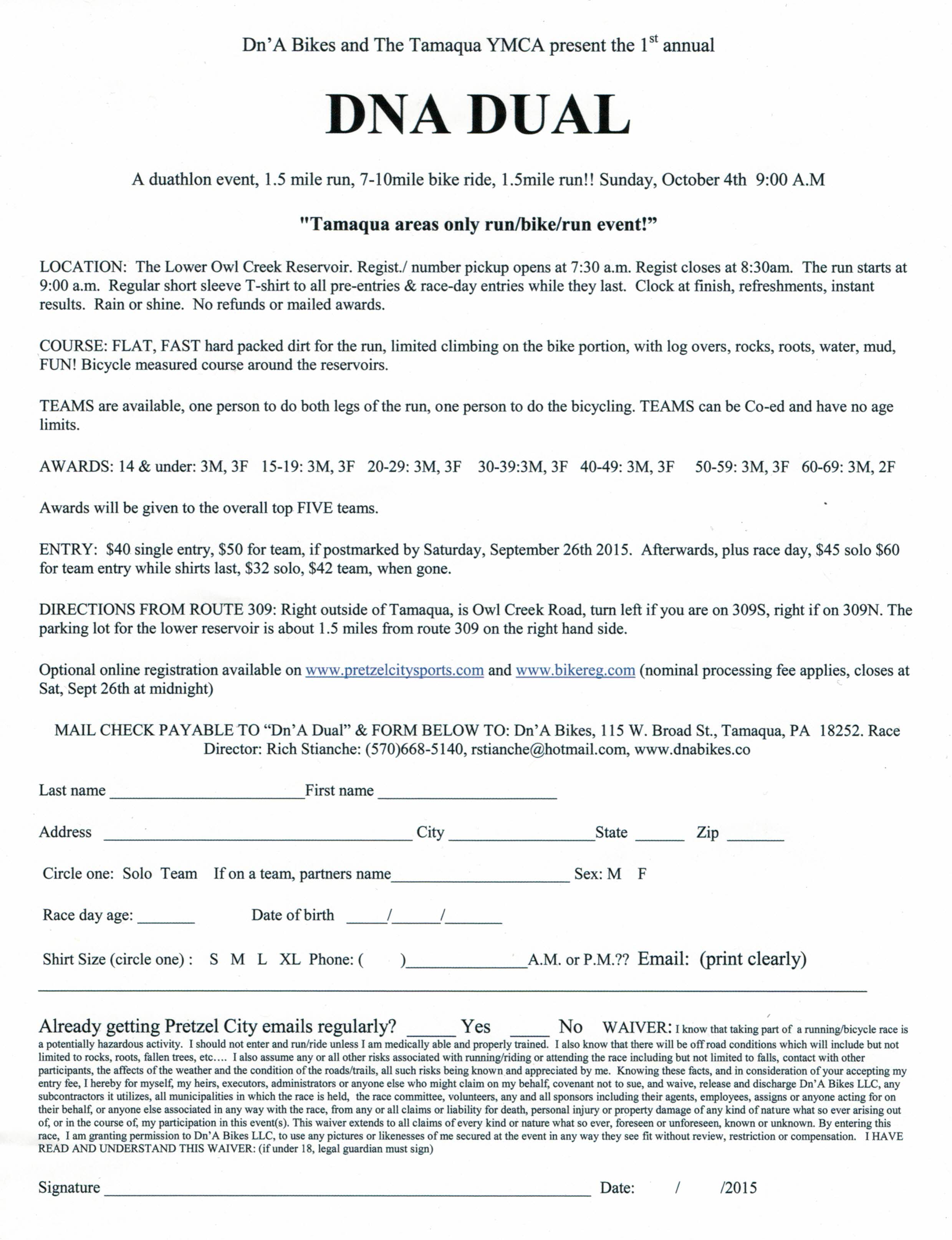 The work is also being done in prelude to the first annual Dn’A Bikes and Tamaqua YMCA Duathlon set for Sunday, October 4, 2015 at the reservoir. Race includes a 1.5 mile run, 7-10 mile bike ride and another 1.5 mile run. Team option is that one person does both runs and second person does bike ride. Teams can be co-ed and there are no age limits. Awards will be presented to top 5 teams.