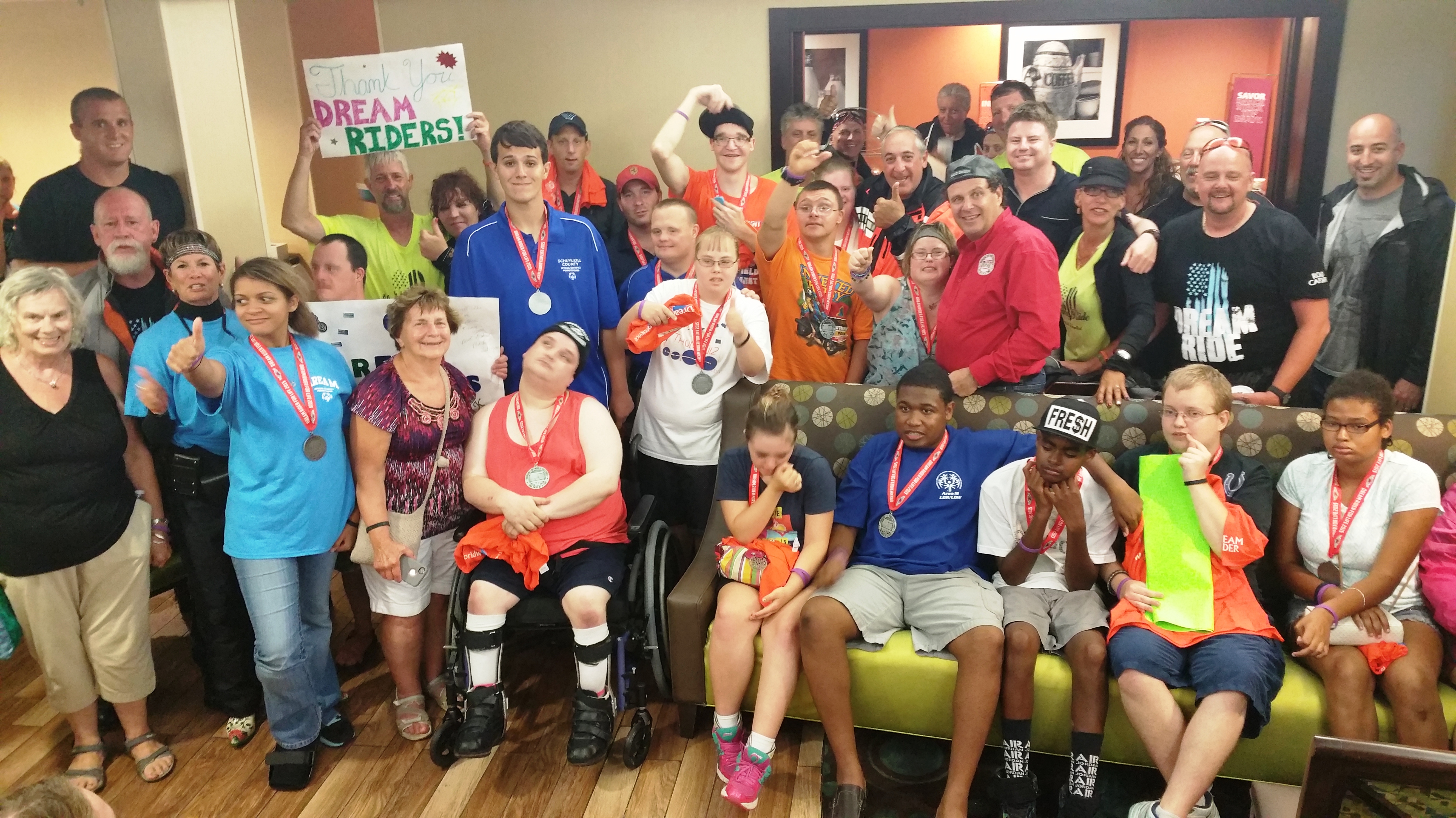 Motorcycle riders with the 15th Annual Dream Ride were greeted by over 20 athletes from Special Olympics of Schuylkill County as they arrived in Hazleton on their 7-day benefit tour from Florida to Connecticut to raise donations for Special Olympics. Approximately 30 motorcycle riders arrived in pouring rain around 6:30 PM on Thursday, August 20, 2015 in at Hampton Inn in Hazleton. Their stop in Hazleton served as the only stop in the commonwealth.