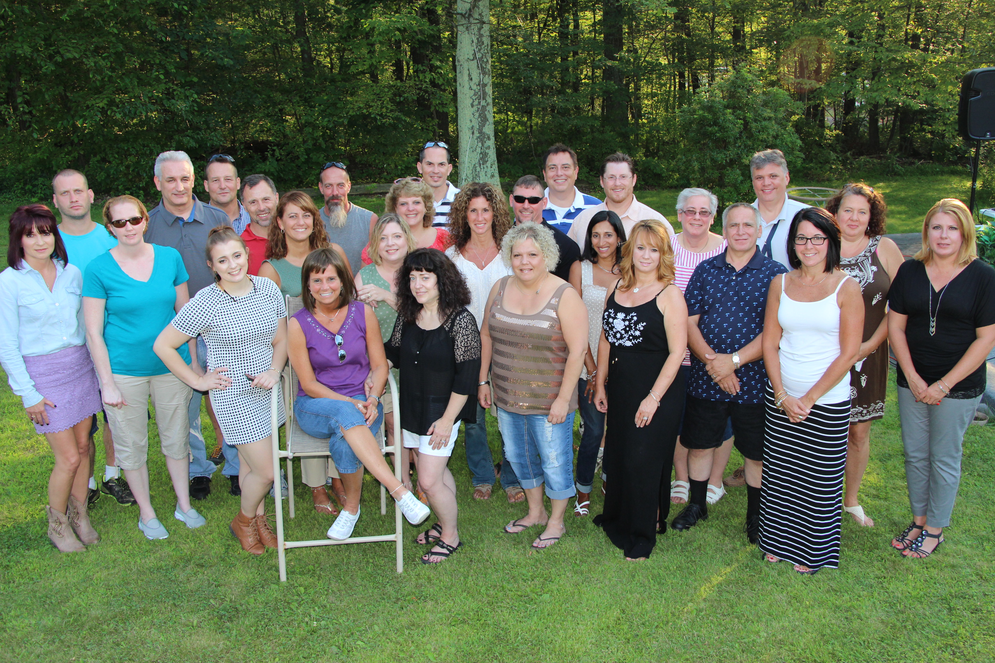 First row from left are Helen (Harahus) Hafer, Kelly Griffiths, Tina (Gaughan) Miller, Christine (Woodward) Boyle, Wendy (Durling) Gerber, and Lisa (Edmunds) Woods. Second row from left are Brian Daubenspeck, Carolyn Marchetti, Michelle (Klatka) Chamberlain, Laurie (Fritzinger) DeAngelo, Sheila (Thompson) Mashak, and Mary (Fredericks) Hosler. Third row from left are Tom Watsula, John Hechler, Dennis Welker, Fran Job, Wendel Paisley, and Andy Tuzinski.