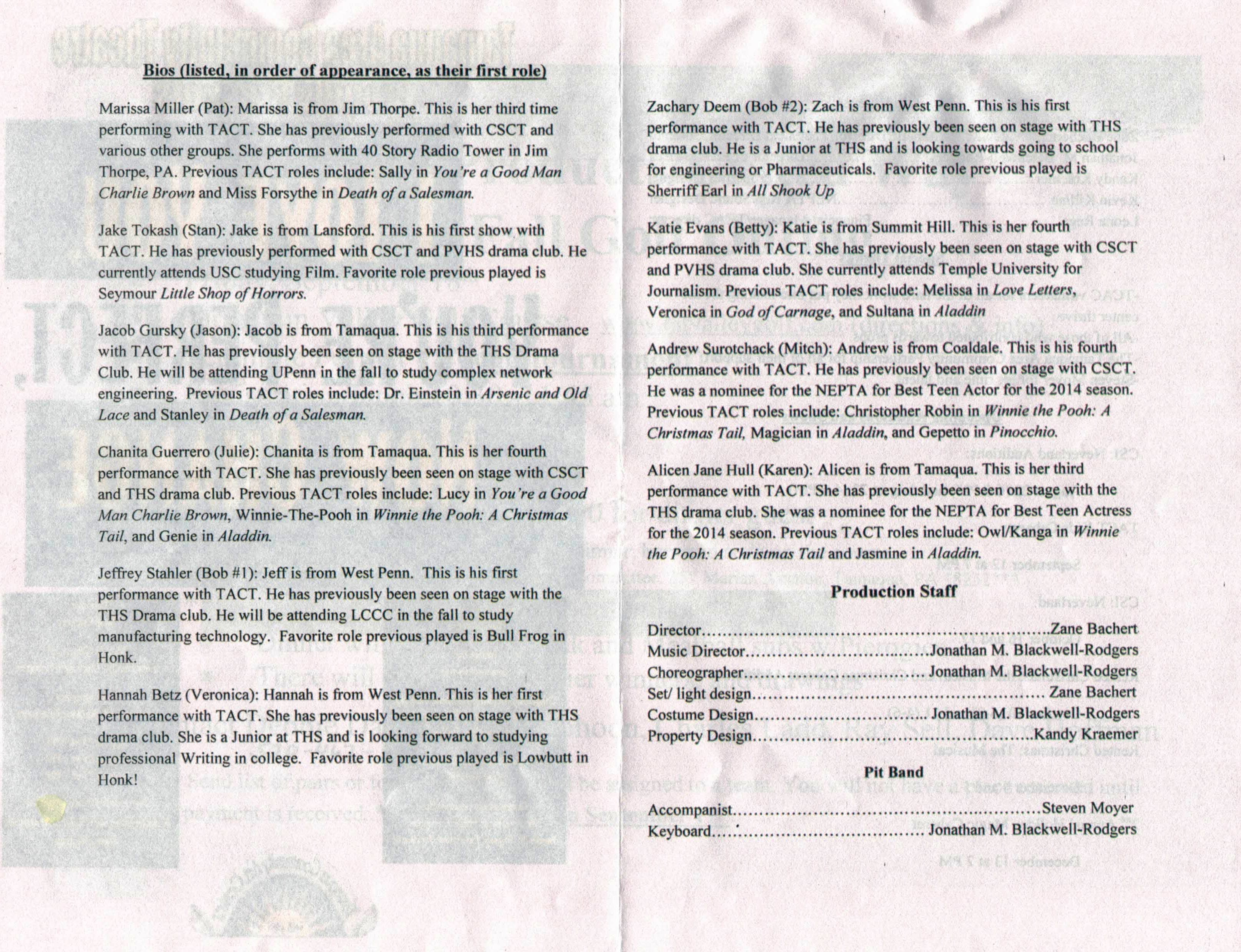 TACT staff and board members include Zane Bachert (artistic director/technical director/co-chair); Jonathan M. Blackwell-Rodgers (director of education/co-chair); Kandy Kraemer (properties designer); Kevin Killian (NEPTA representative/sound designer); and Leona Rega (financial manager/Tamaqua Community Arts Center director).