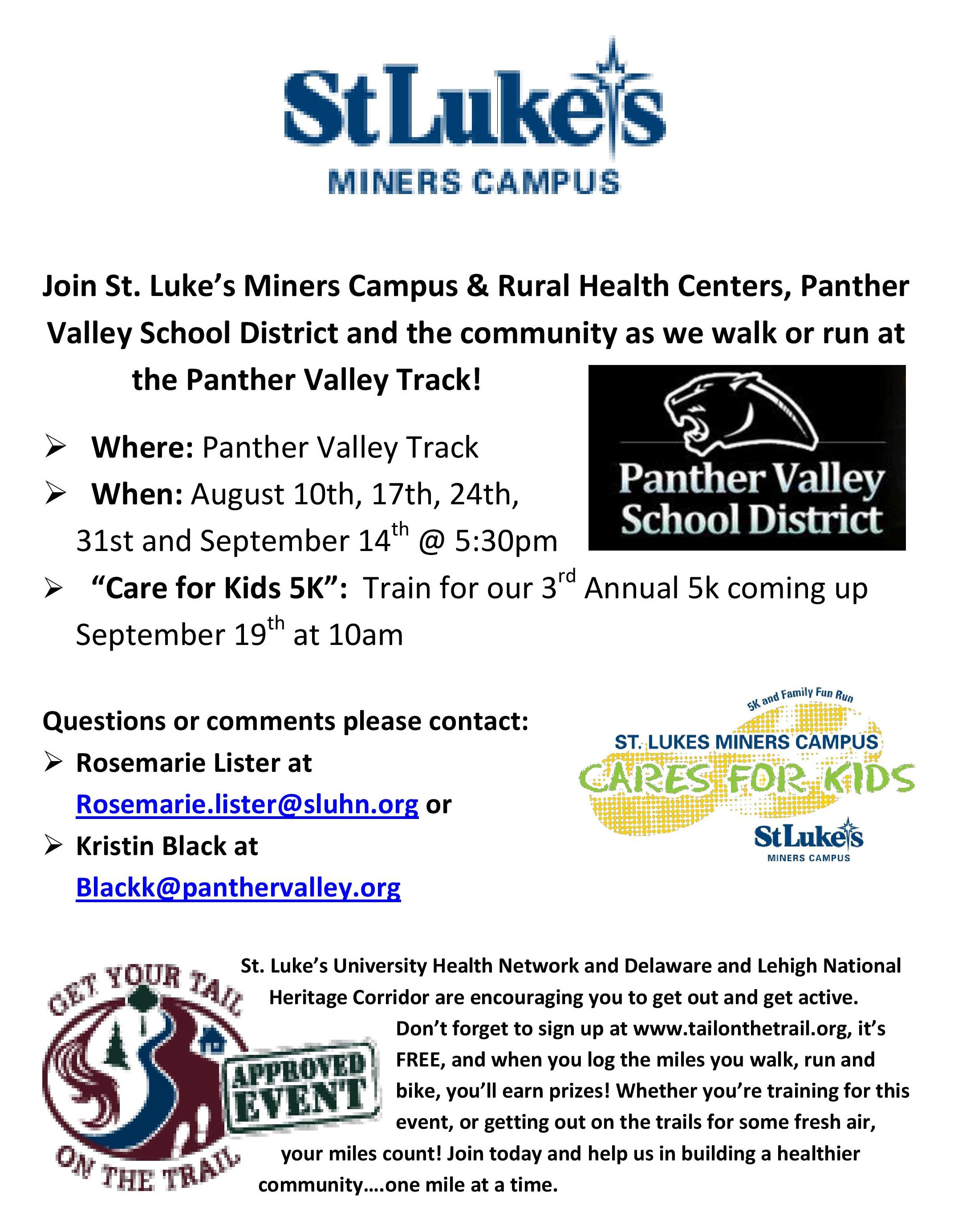 St. Luke’s University Health Network partnered with the Panther Valley School District to hold their annual ‘Get Your Tail on the Trail’ kick-off event on August 17, 2015 at the Panther Valley Stadium in Lansford.