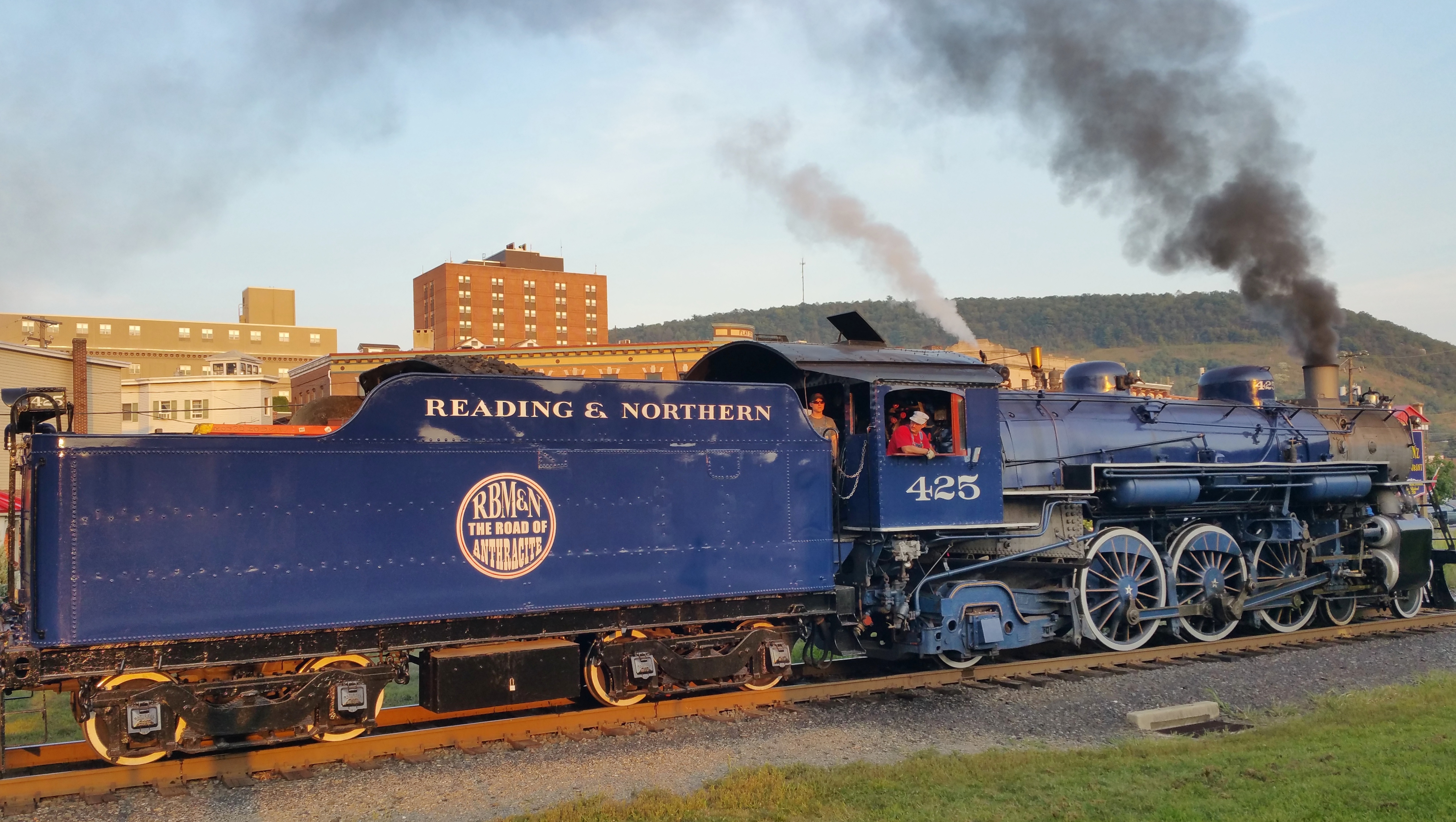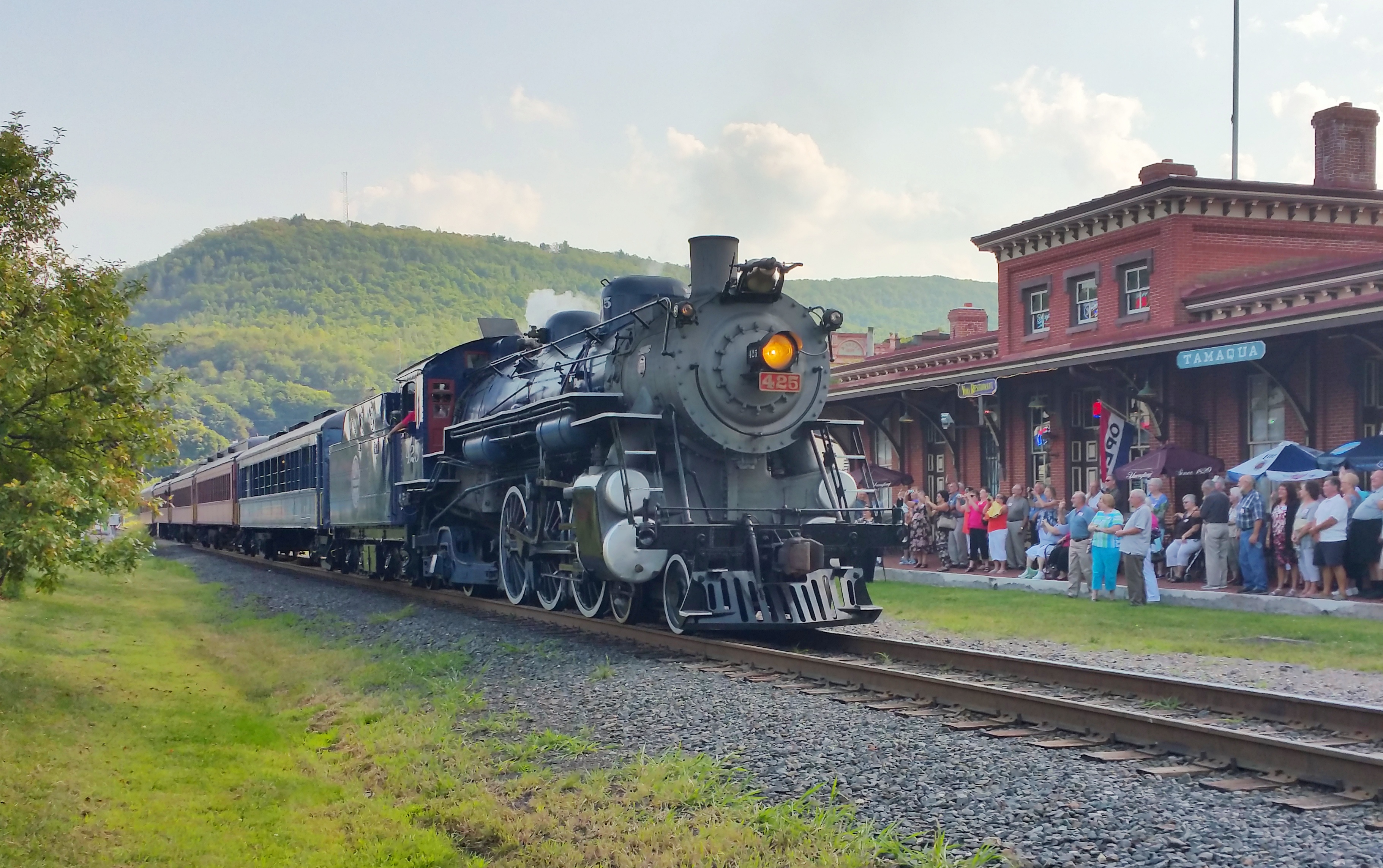 The 1928 Reading, Blue Mountain and Northern No. 425 steam engine made its way through Tamaqua twice yesterday (Saturday, August 29, 2015) as part of a train ride excursion for the Hamburg Area High School class of 1965 50th reunion. Andrew J. Muller Jr, the owner of the railroad, was a member of that class.