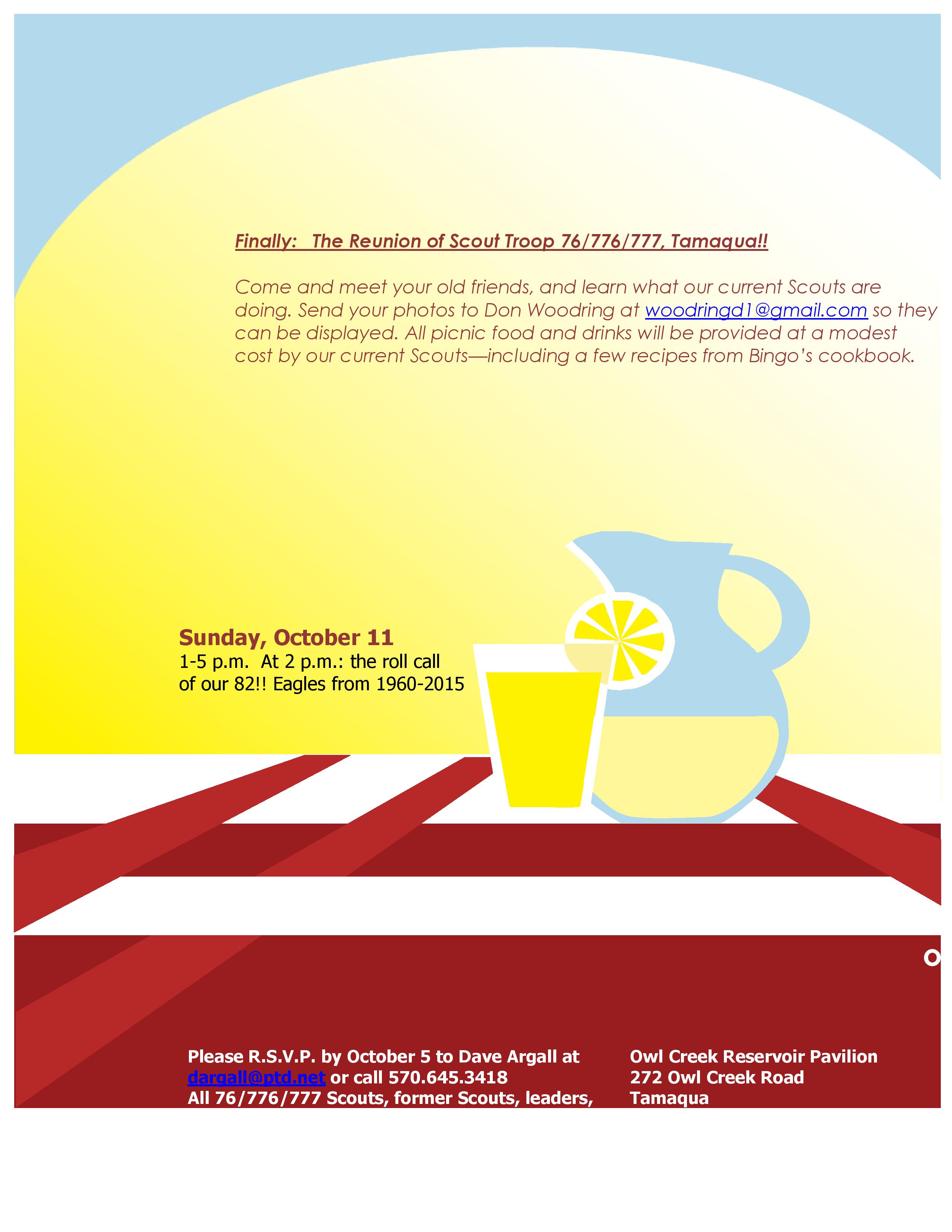 PRESS RELEASE – (from David Argall) – All former and current members of Tamaqua Boy Scout Troops 76, 776, and 777, sponsored by Zion’s Evangelical Lutheran Church and St. John’s United Church of Christ since 1960, are invited to attend a special reunion picnic at the Owl Creek Reservoir Pavilion on Sunday, October 11, 2015 at 1 PM.