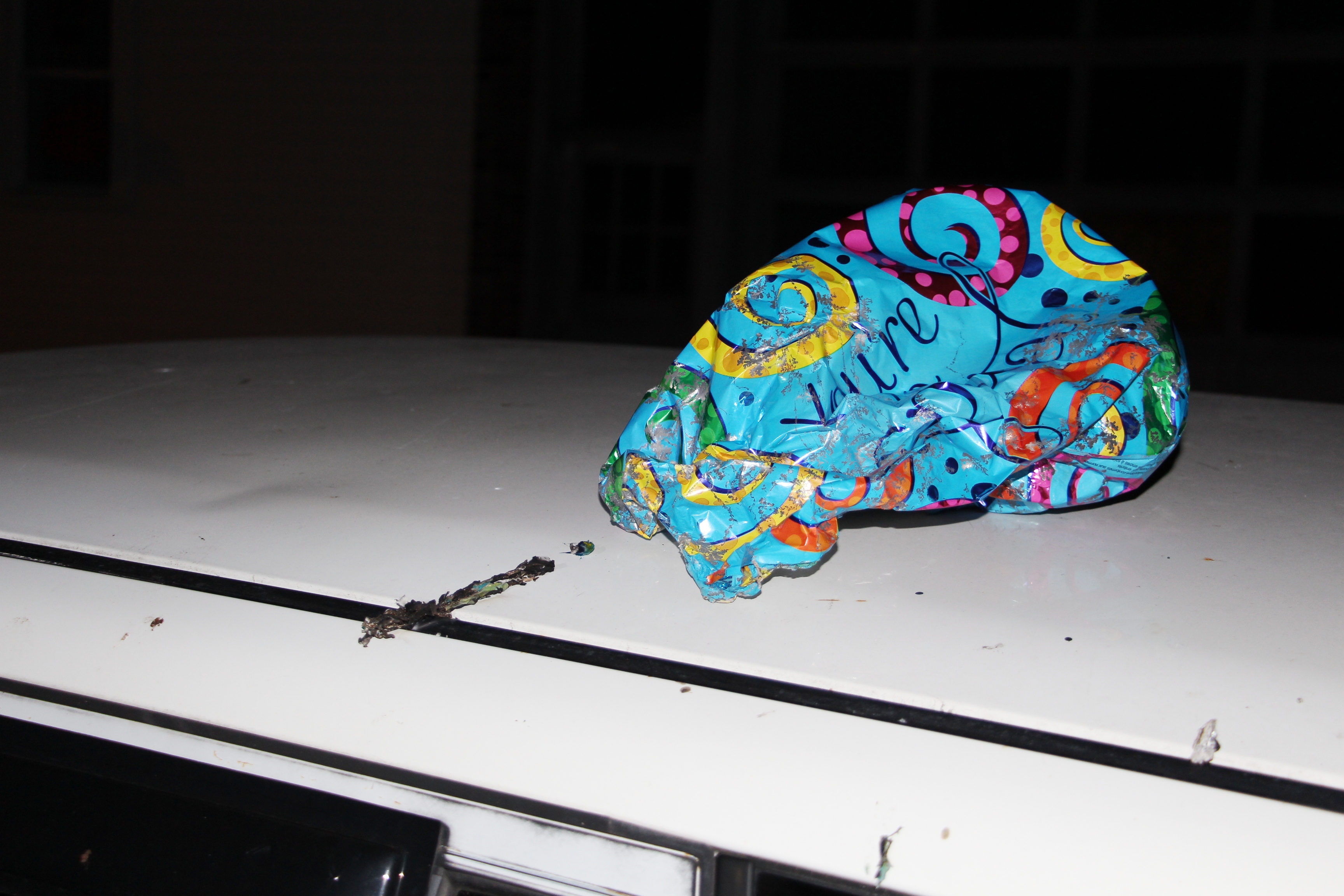 Burnt balloons could be seen laying on the ground below the wire, as well as melted to the truck below.