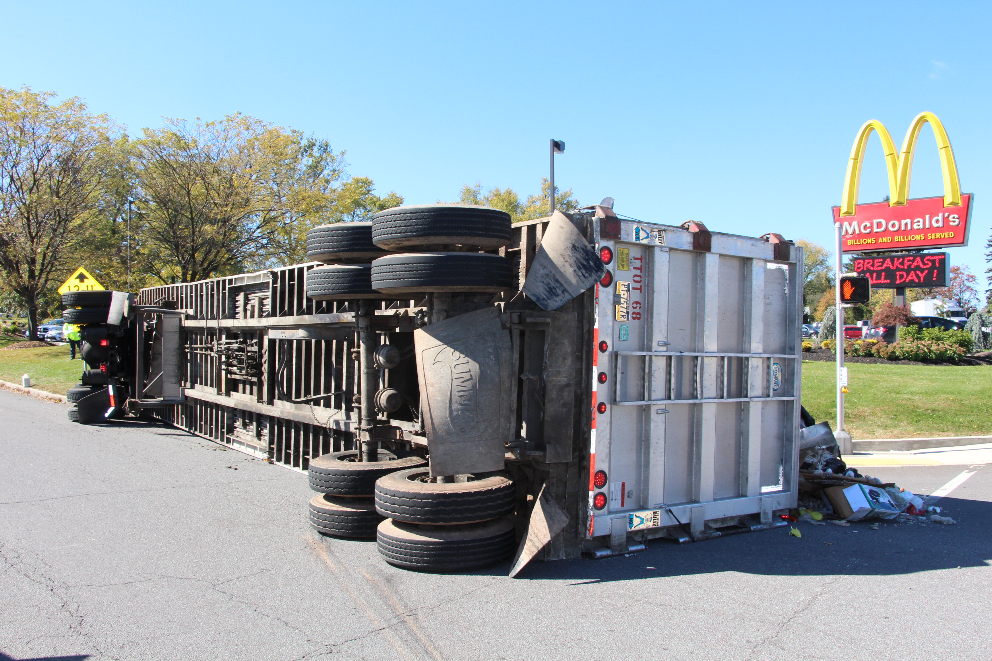 Emergency personnel were dispatched around noon today (Monday, October 19, 2015) to SR54 just west of the SR309 intersection in Hometown for a report of an overturned tractor-trailer hauling residual waste. Some of the trailer’s load was spilled on the roadway and onto the lawn of McDonald’s restaurant.