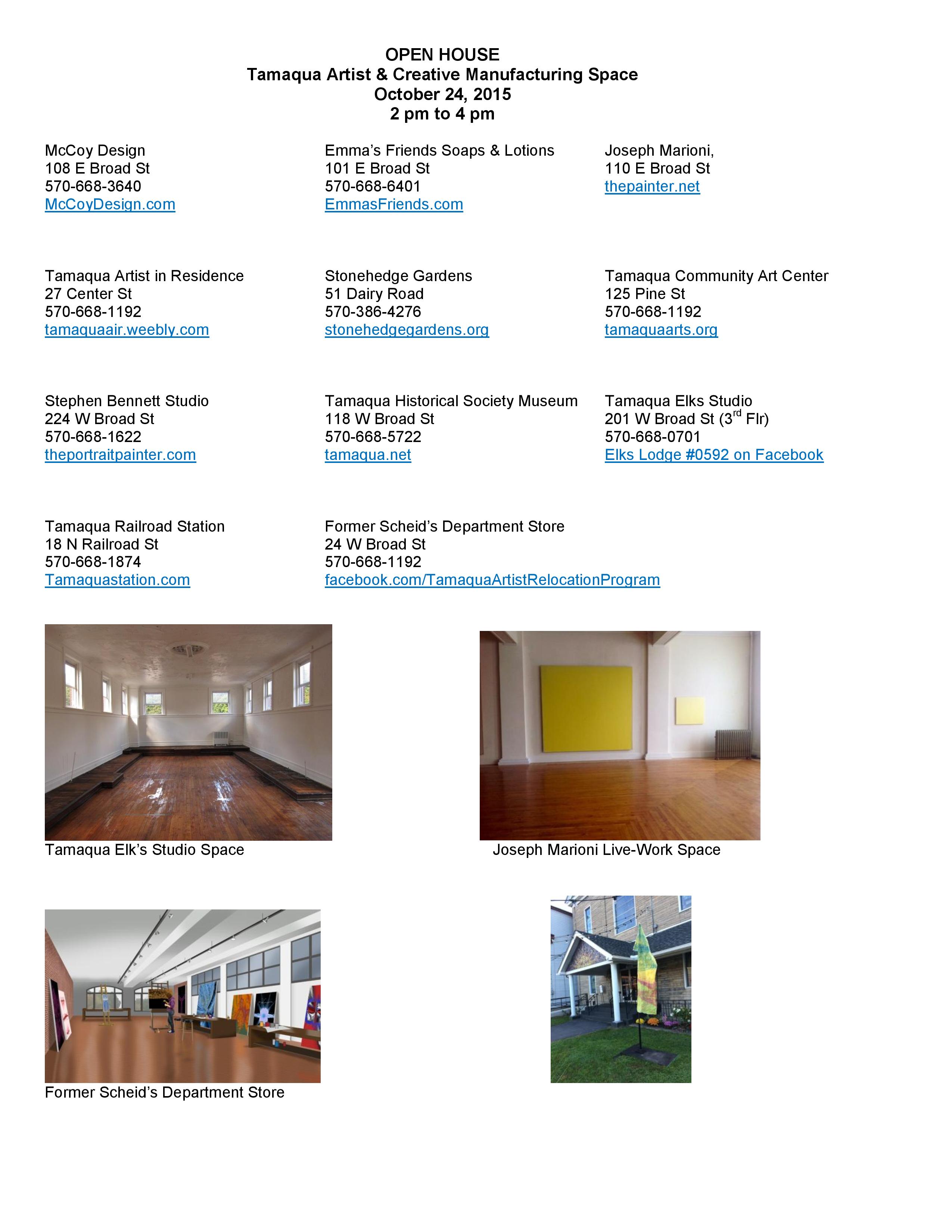 Various artists in and around Tamaqua will be holding open houses this Saturday (October 24, 2015) from 2 PM to 4 PM.