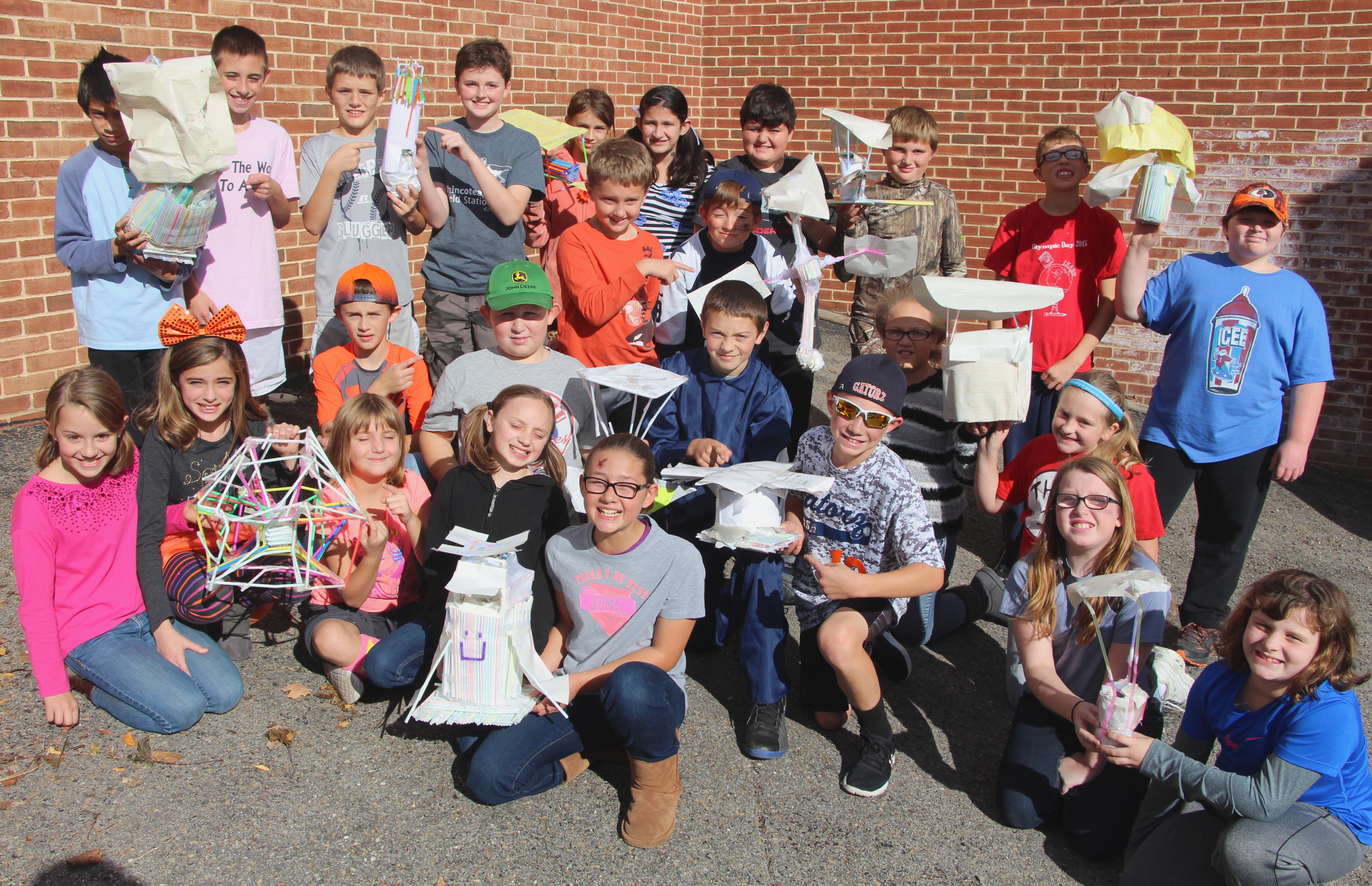 Fifth grade students held their breath this afternoon as their science projects were dropped off the roof of the West Penn Elementary School by teacher Tim Gombar during the annual Egg Drop Challenge. The event encouraged students in small teams to create a lightweight “container” that would prevent a raw egg from breaking when dropped from a high level, such as the top of the school.