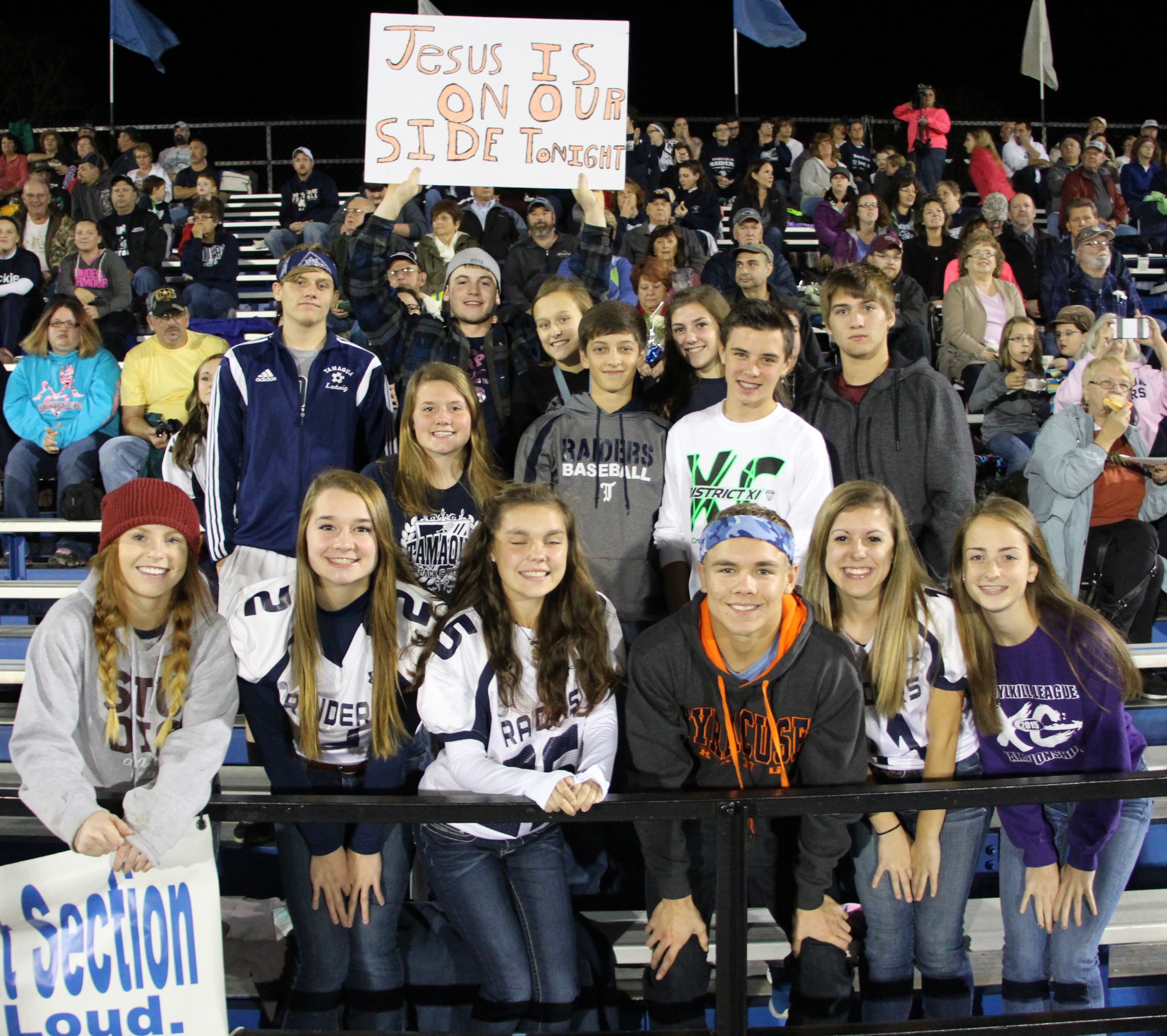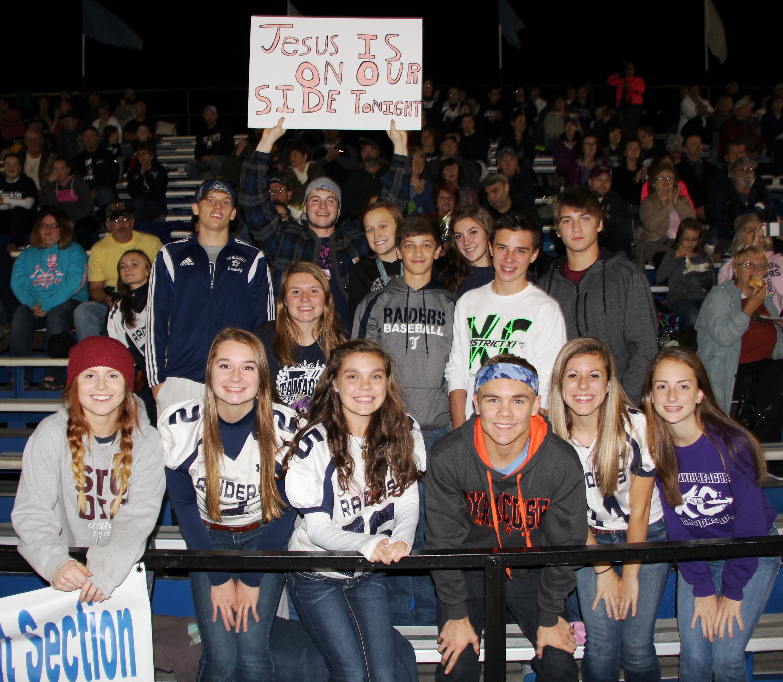 Showing both pride and humor, students and fans with the Tamaqua Raider Squad section hold a sign during last night’s Tamaqua Raider Football Game that reads, “Jesus Is On Our Side Tonight.” Tamaqua won over Marian High School 31 to 21. The squad said both teams did a great job.