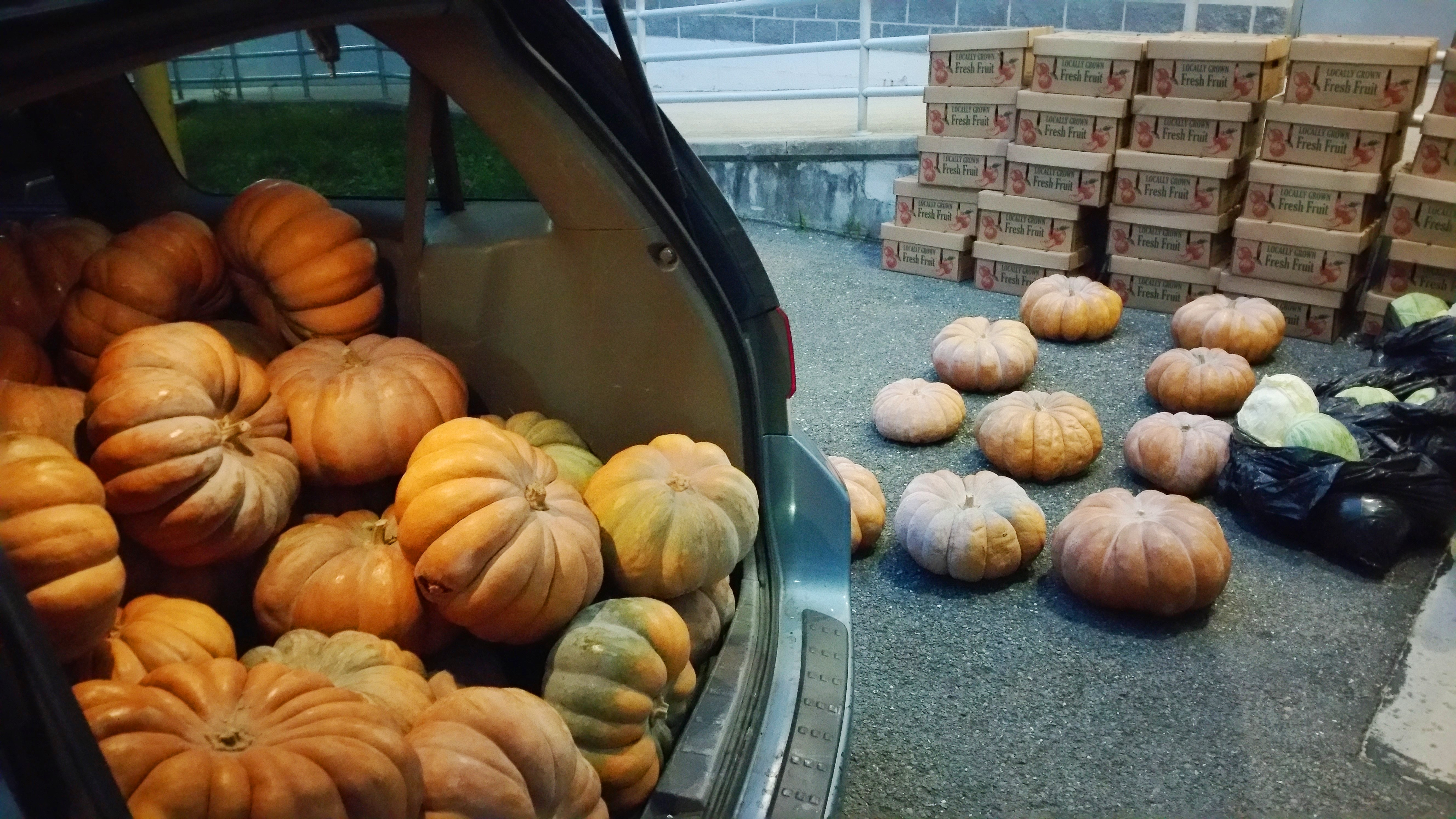 Two bags of apples and (two small pumpkins/one large pumpkin) / per household. First come, first serve.