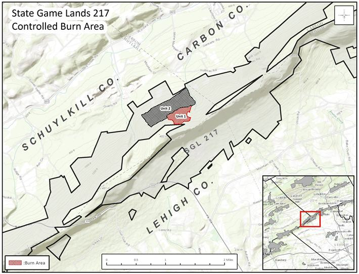 State Game Land 217, totaling 7,647 acres, is located in northern Lehigh, southern Carbon and southern Schuylkill counties. It contains a wide variety of habitat types within its borders and is home to a multitude of different wildlife species. Since over 97% of this State Game Lands is forested and 95% of that area consists of mixed oak forests, the use of a prescribed burn is very appropriate.