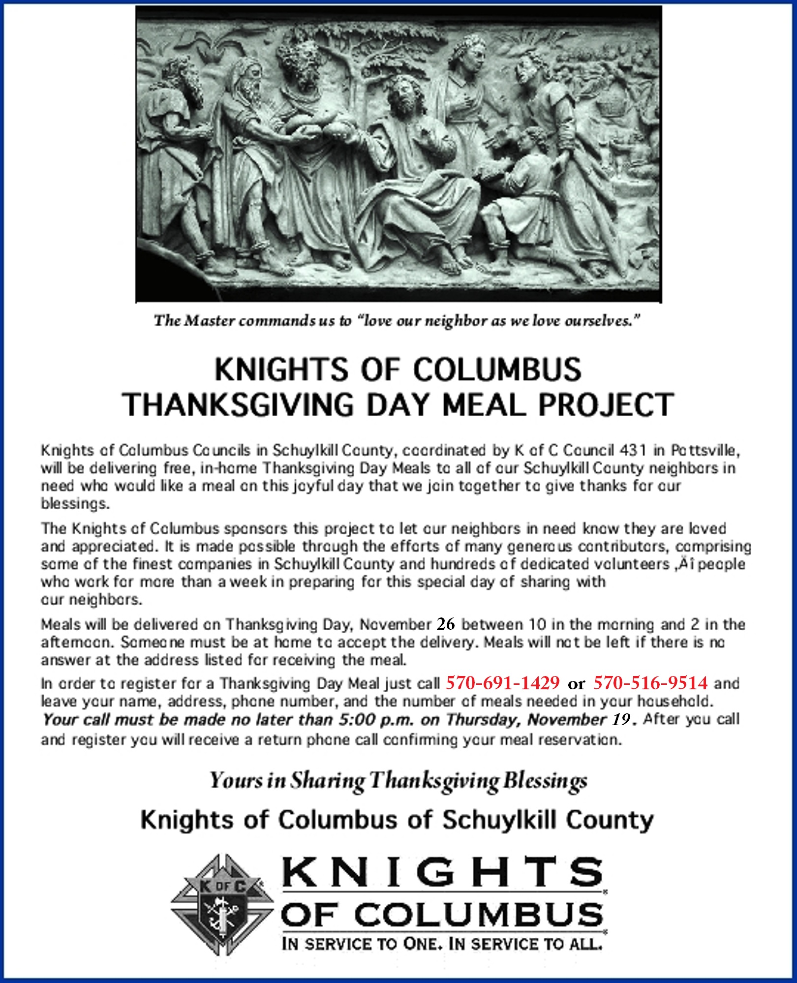 The Knights of Columbus – Schuylkill Council 431 is offering free Thanksgiving Day Dinners to all Schuylkill County residents. Meals are delivered or picked-up on Thanksgiving Day (Nov. 26). Cut-off date to order is this Thursday, November 19, 2015 at 5 PM.