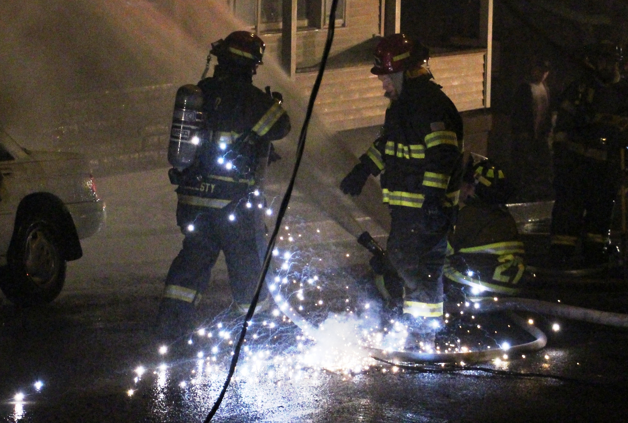 Adding to the stubborn blaze and two vehicle fires, emergency officials had to work around live arcing wires laying on the water-covered street. Sparks routinely ignited as firefighters walked around the wires. PPL arrived shortly after to turn off power to the block. Power was restored to most homes around 1 AM.