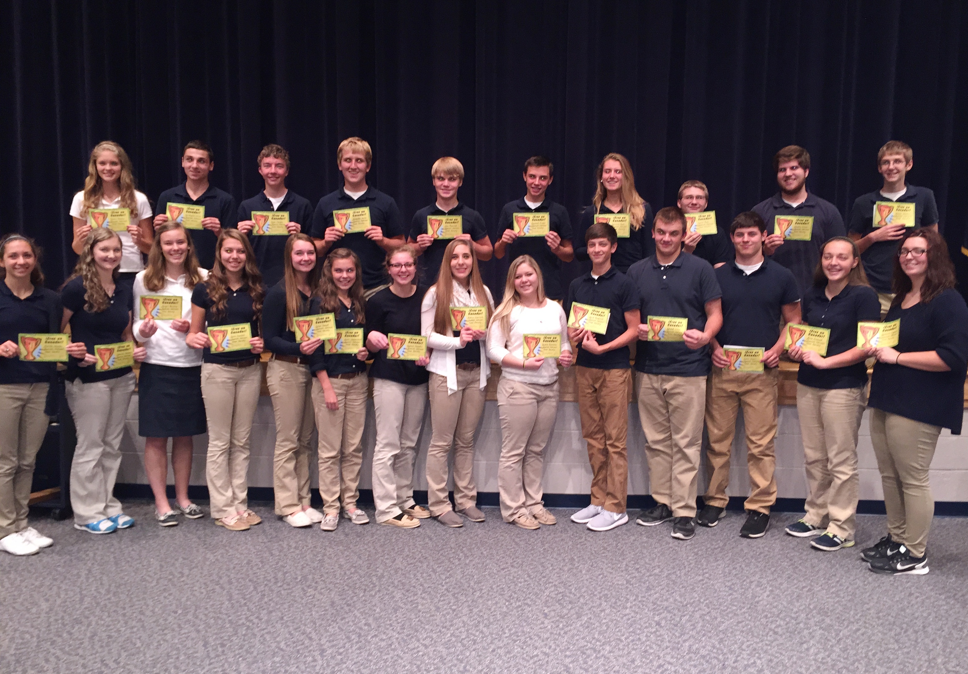 From front left are Monika Shimko, Samantha Shamonsky, Abigail Brickler, Emma Osenbach, Cailyn Joseph, Nicole Wasserleben, Rebecca Kanaskie, Andrea Iacoviello, Brianna Bonetsky, Jacob Banditelli, Edward Titus, Collin Moyer, Alexa Hromyak and Isabella Ligenza. From back left are Deidra Ressler, Christopher Miller, Ryan Murphy, Alexander Verta, Alec Roseland, Raymond Kinder, Genevieve Beck, Connor Ruch, Stephen Oravec, Connor Ruch and Jasper Stocker.
