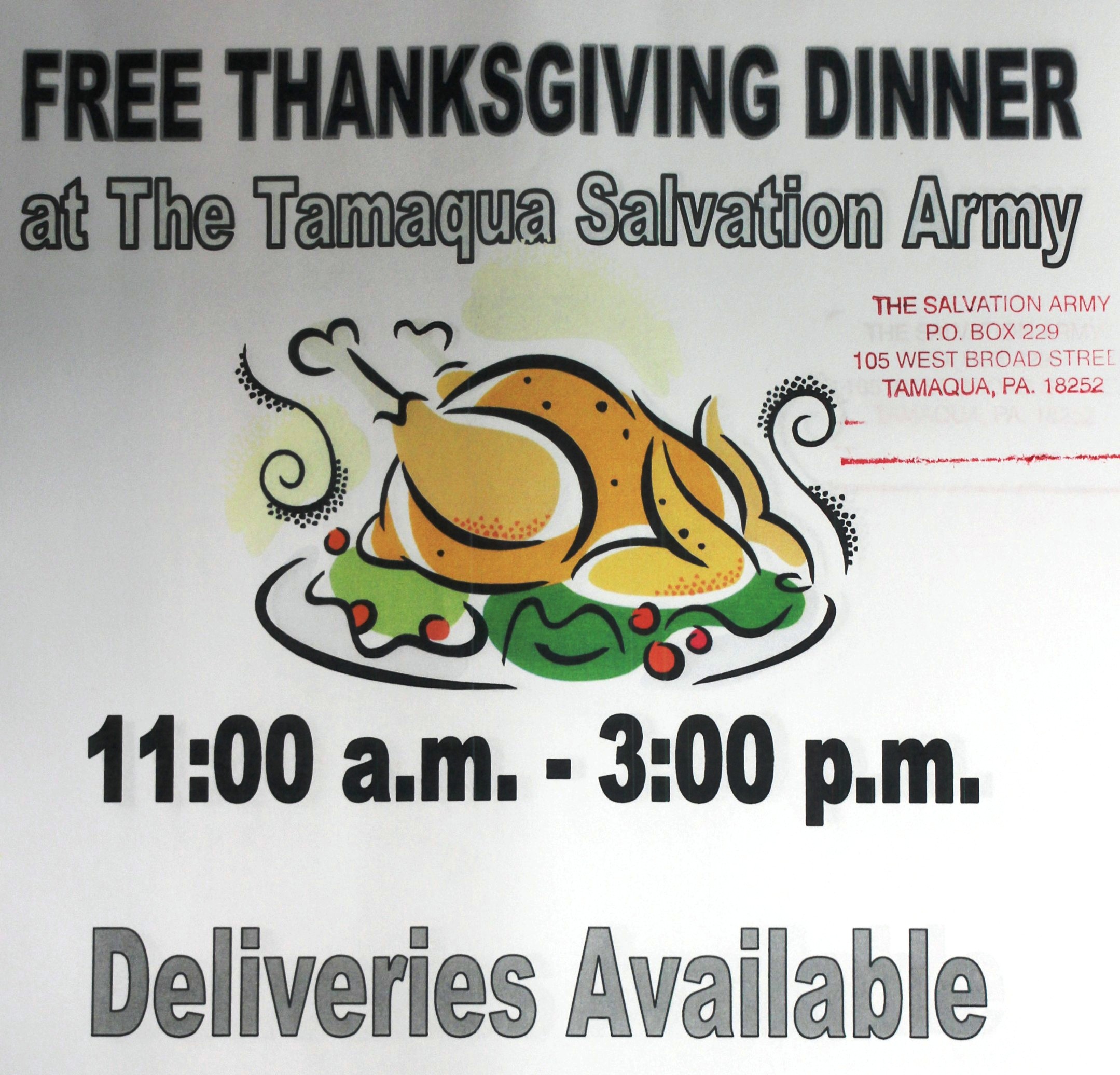This is another reminder about the free Community Thanksgiving Day Dinner being held tomorrow (Thanksgiving Day, Nov. 26, 2015) from 11 AM to 3 PM at the Tamaqua Salvation Army.