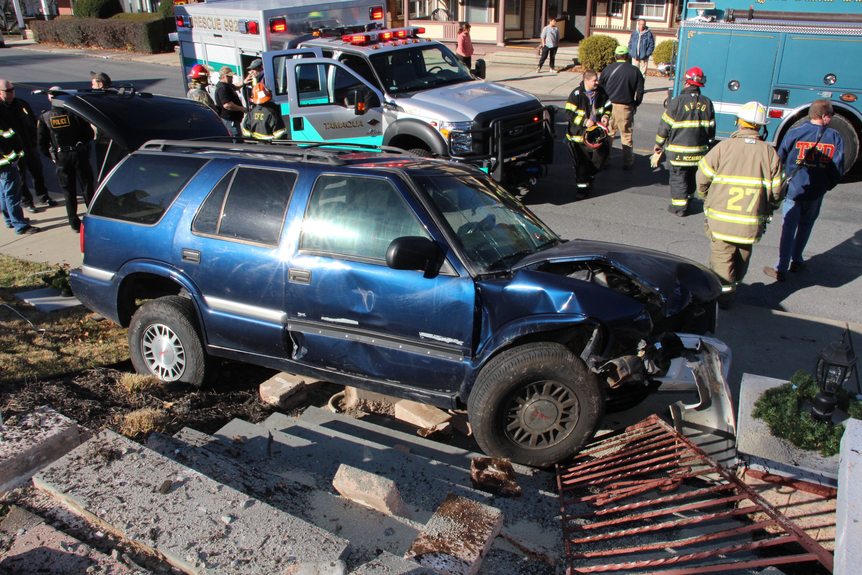 The vehicle was traveling east when it apparently failed to negotiate a turn at the 500 block of East Broad Street. It continued over a sidewalk, up a small embankment, and into two brick landscape columns in front of 518 East Broad Street.