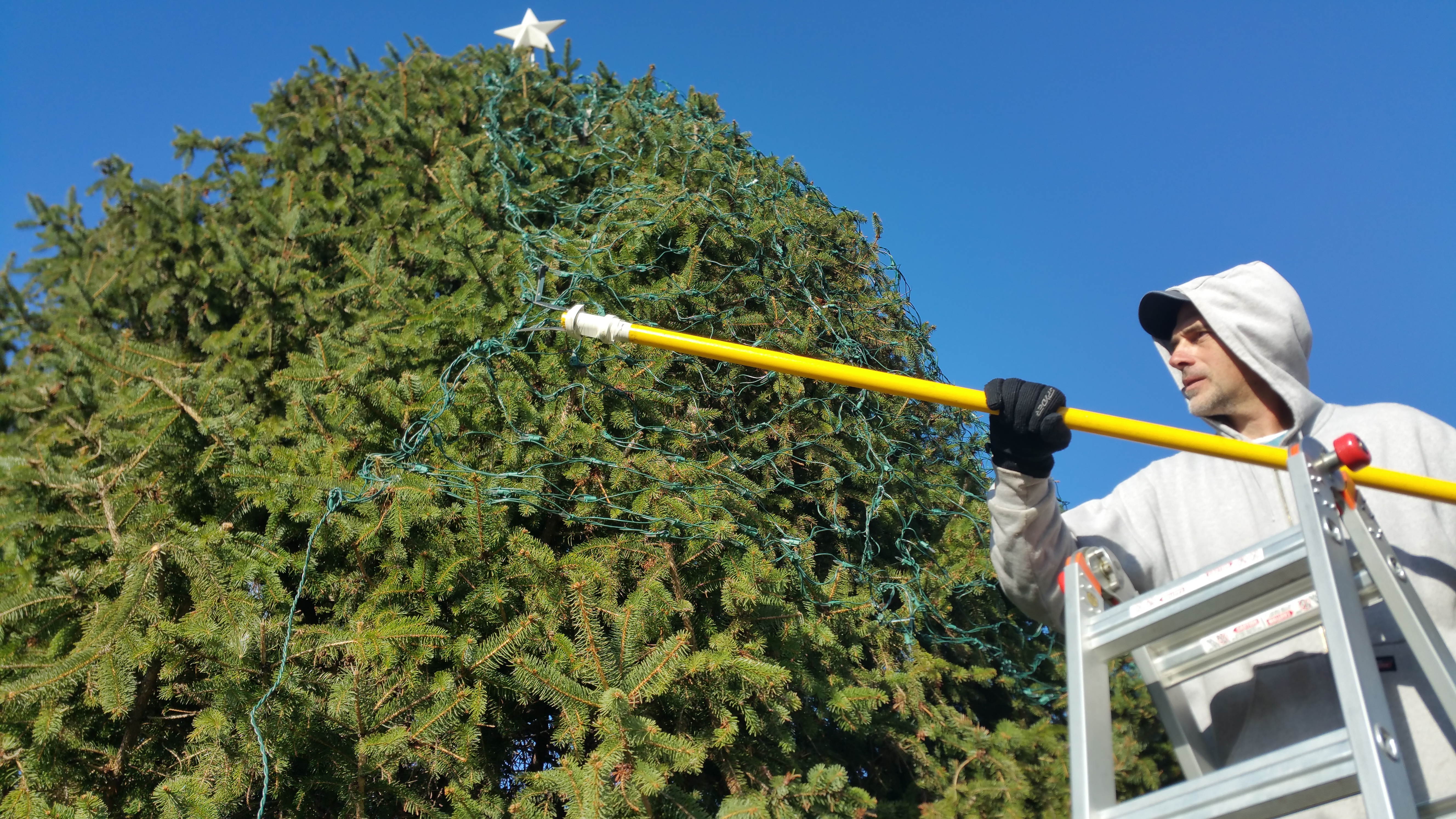 Pictured is Frank Fabrizio arranging thousands of holiday lights in preparation for Tamaqua’s Spirit of Christmas Tree Lighting this Sunday (Dec. 6) at the Depot Square Park.
