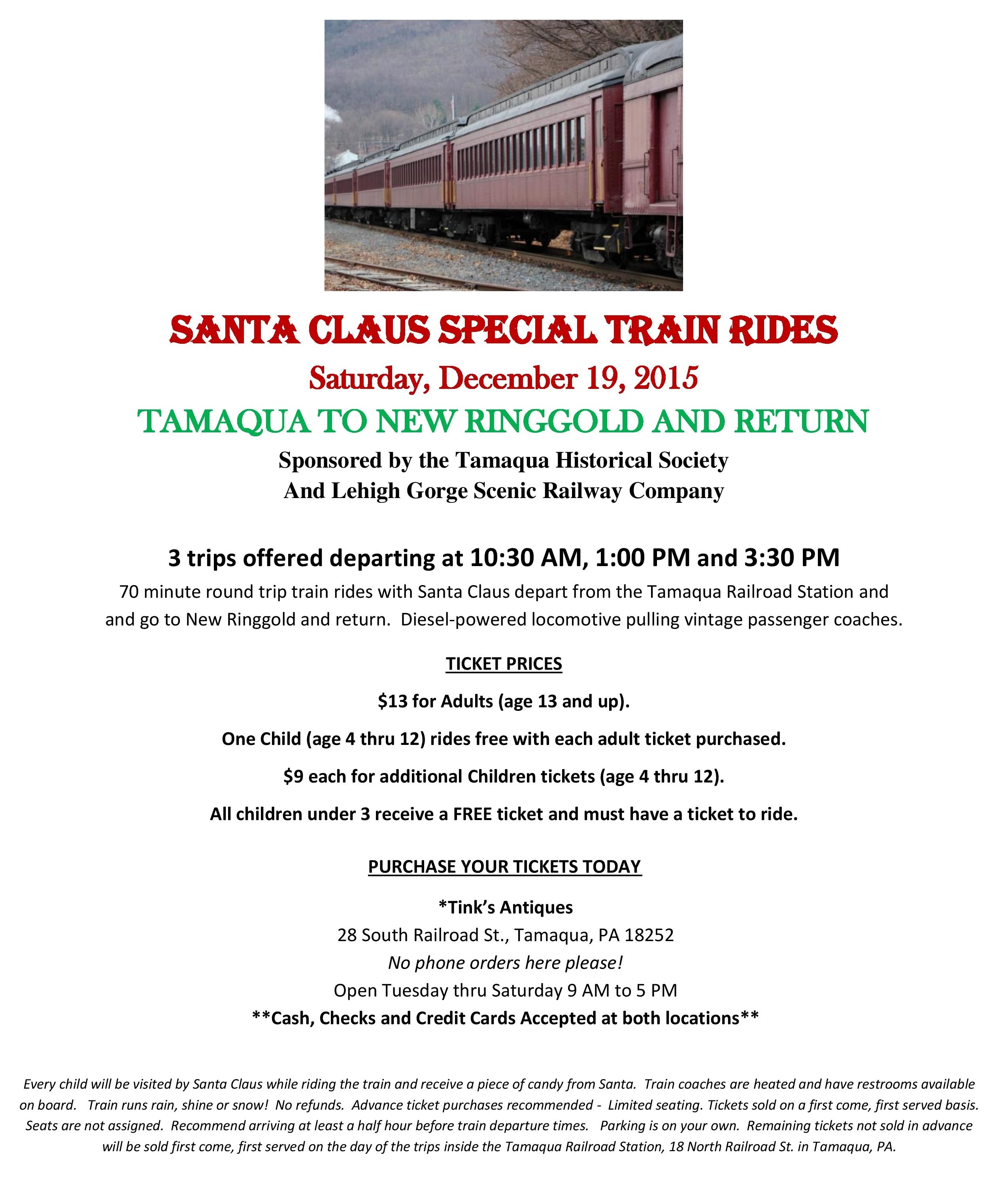 The Tamaqua Historical Society is selling tickets for their annual Santa Claus Special Train Rides scheduled this Saturday, December 19, 2015. Tink’s Antique Shop, 28 South Railroad Street, in Tamaqua is the only location to buy train ride tickets. They are open Tuesday thru Saturday from 9 AM to 5 PM. Cash, checks and credit card purchases accepted for tickets.