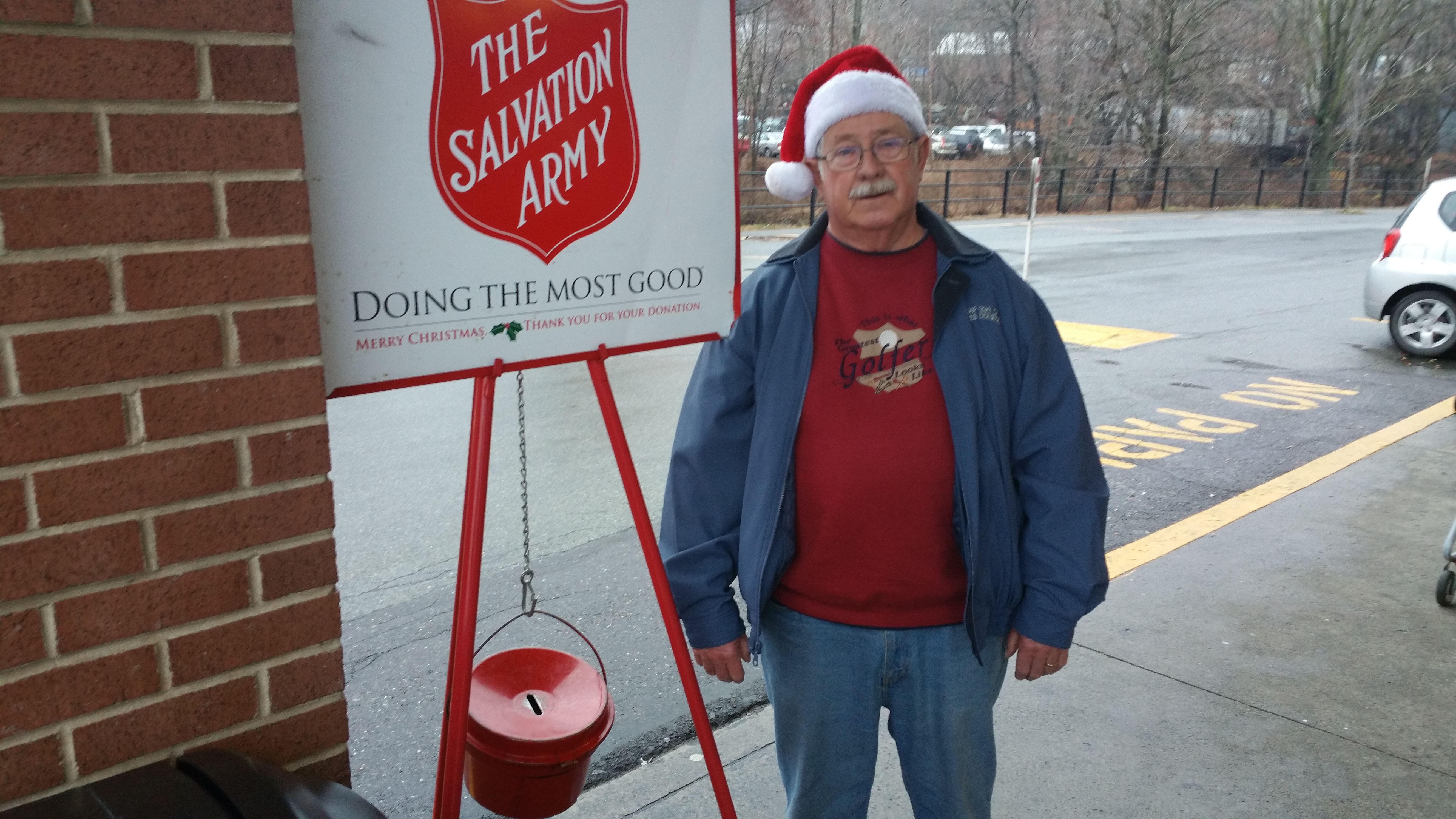 Pictured is longtime volunteer Pat Fredericks standing at a Tamaqua Salvation Army Red Kettle outside Boyer’s Food Market in Tamaqua. Fredericks, who has dedicated 8 years as a kettle volunteer, routinely contributes his time with various programs and services of the Salvation Army.