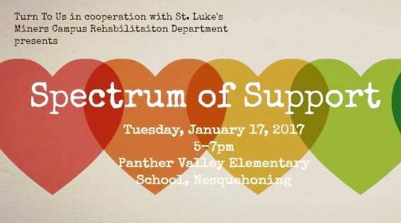Turn To Us, in cooperation with St. Luke’s Miners Campus Rehabilitation Department, will be holding a free Spectrum of Support event on Tuesday, January 17, 2017 at the Panther Valley Elementary School in Nesquehoning. The event runs from 5 to 7 p.m.