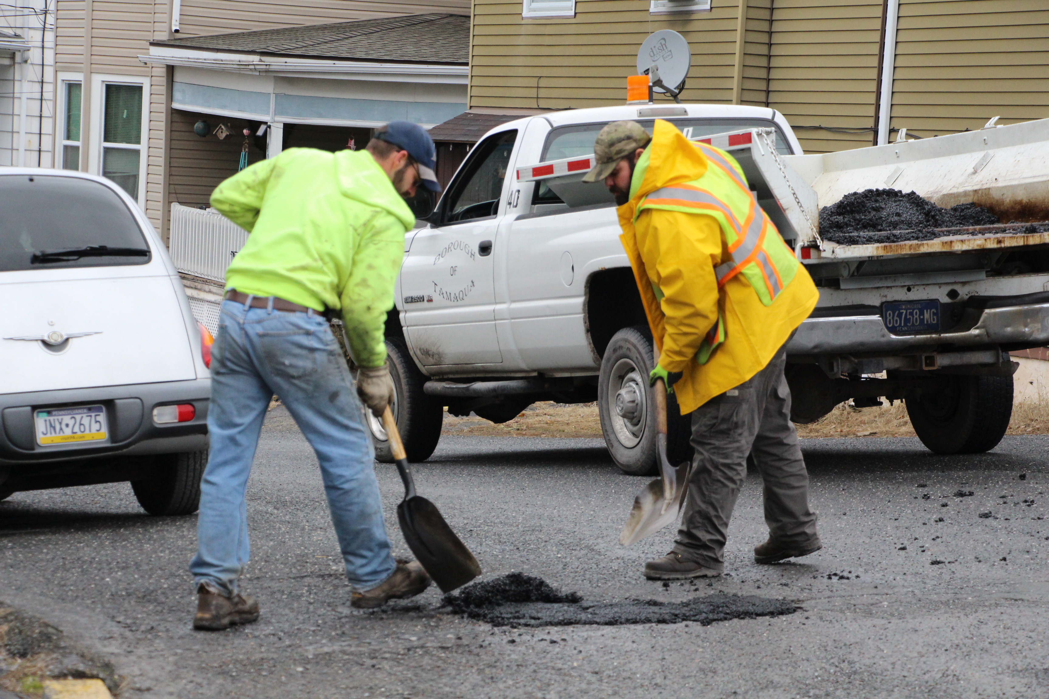Pictured are Tamaqua borough workers Aaron Coggiano and Mark Leiby fixing pot holes today.